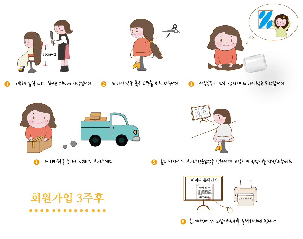 그러던 어느 날 트위터를 하던 내 눈에 흥미로운 링크 하나가 들어왔다. '어머나운동본부'라는 곳인데, 이 곳은 머리카락 길이가 25센티미터만 넘는다면 딱히 조건을 따지지 않고 받아 주신다는 것이다. 당시 이런저런 사유로 머리카락을 자르지 않고 기르고 있던 아내에게 이 글을 보여 줬더니, 드디어 자기도 머리카락 기부를 할 수 있게 되었다며 신나 했다. 나도 머리카락을 단발에 가깝게 길러 본 적이 있지만, 뒤로 묶을 수 있는 머리카락의 길이가 25센티가 넘어갈 만큼 기른다는 것은 엄청난 인내력과 번거로움을 필요로 하는 일이다. 감고 나서 말리는 것도 한세월이고, 물 먹은 머리카락은 무겁기 짝이 없으며, 겨울이라도 되면 머리카락이 꽁꽁 얼어 몽둥이마냥 변하는 일도 있다는 것이다. 그렇게 얼마나 길렀는지도 모를 만큼 오랫동안 머리카락을 자르지 않고 두었더니, 마침내 아내의 머리카락은 제법 길어서 허리춤에 닿을 수준까지 내려오게 되었다. 때는 이 때다.