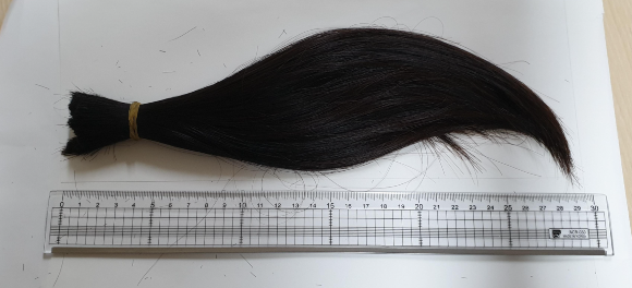 '머리카락 25센티미터 이상'의 기준이 어디까지인지는 확실하지 않지만, 머리를 묶지 않고 풀었을 때 딱 보기에도 어깨 아래 선에서 머리카락 끝까지 쟀을 때 30센티미터는 족히 넘어 보였다(좌). 기부용 머리카락을 자를 때에는 일단 자를 부분 바로 아래를 고무줄로 묶어서 고정한 뒤 가위로 잘라낸다고 한다. 시험삼아서 집에서 포니테일로 묶은 뒤 머리카락 길이를 다시 재 봤는데, 30센티미터 남짓 잘라내도 어깨선 근처에서 잘 마무리되리라는 사실을 다시금 확인하게 되었다(우). 이제 남은 것은 미용실에 가서 머리카락을 자르고, 이걸 봉투에 담아 부치는 것뿐이다.