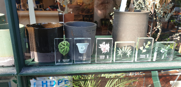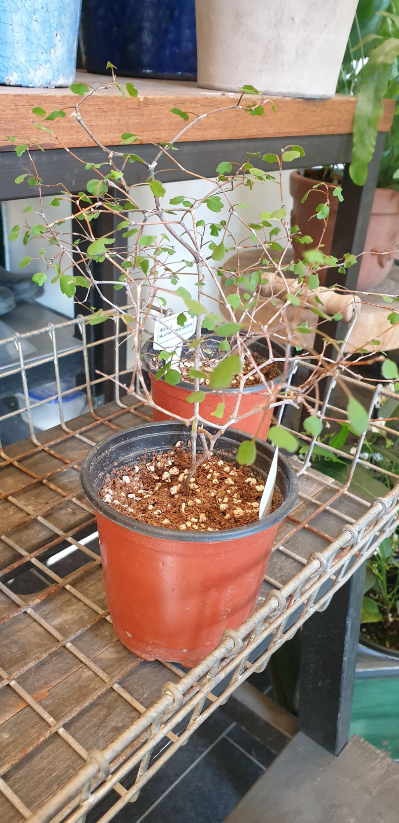 오늘은 굿즈를 먼저 둘러본다. 가게 바깥에도 전시되어 있었던 미니멀하고 예쁜 아크릴 스탠드 하며, 관엽식물의 이파리 모양을 한 그립톡과 열쇠고리 등이 퍽 마음에 들었다. 가격은 흉악했지만. 아내에게 사진을 보내 줬더니 분홍색 칼라디움 그립톡을 마음에 들어했는데, 가격을 듣자 곧 단념한다. 돈 열심히 벌어야 덕질도 한다. 식물들을 둘러보는데, 마오리 소포라와 함께 놓여 있는 퍽 소포라스럽게 생긴 식물 하나가 눈에 들어온다. 수형은 소포라와 비슷한데 이파리가 하트 모양이라 귀엽다. 뮬렌베키아 애스토니Muehlenbeckia astonii라는 뉴질랜드 출신 관목이란다. 오늘의 식물은 너로 정했다. 사장님들이 곱게 신문지로 싸서 주시면서, 화분에 겉흙은 말라 보이겠지만 속에 물이 많이 있으니 바로 물을 주지는 마시라고 당부를 하신다. 소포라처럼 키우면 되냐니 그렇단다. 그렇다면 자신 있다. 우리 집 소포라는 관목을 넘어서 교목이 될 기세로 성장하고 있거든.