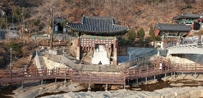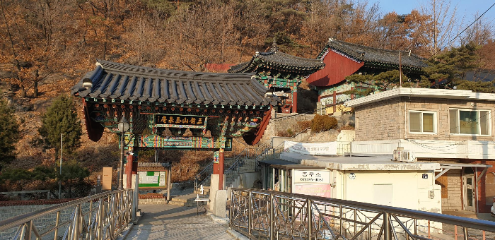 여기서부터 홍제천을 따라 쭉 내려가다 보면 집 근처로 닿을 수가 있다. 내려가는 길에 문득 생각지도 못했던 고풍스러운 절 하나가 모습을 드러낸다. '옥천암'이다. 언제 세워졌는지는 알 수 없지만, 중창된 것은 구한말 명성황후가 이 곳에 기도도량을 세우라는 명을 내렸을 때라고 한다. 의도한 것인지는 알 수 없지만 세검정로에서 홍제천을 가로질러 절 일주문까지 세워져 있는 다리 '보도교'가 마치 이승과 피안을 잇는 다리와도 같은 느낌을 준다. 이 밑에 있는 마애불이 그야말로 장관인데, 찾아보니 '보도각 백불'이라고도 불리는 옥천암 마애좌불상(보물 1820호)이라고 한다. 무려 고려 시절에 새겨진 대불이란다. 조각 양식 등을 따지건대 고려 초기부터 있었을 가능성이 있으며, 태조 이성계가 여기에서 기도했다는 전승마저 있다고 한다. 온통 조선의 것으로 도배되어 있다고만 생각했던 서울 한복판에 이렇게 고려 시대부터 내려온 웅장한 마애불이 떡하니 좌정하고 있고, 아직도 많은 사람들의 신앙의 대상이 되고 있다는 사실이 그저 놀라울 뿐이다. 열심히 사진을 찍는 내 옆을 여러 신도들이 지나가다가 한 번씩 멈추어 합장을 하곤 절 안쪽으로 들어갔다.