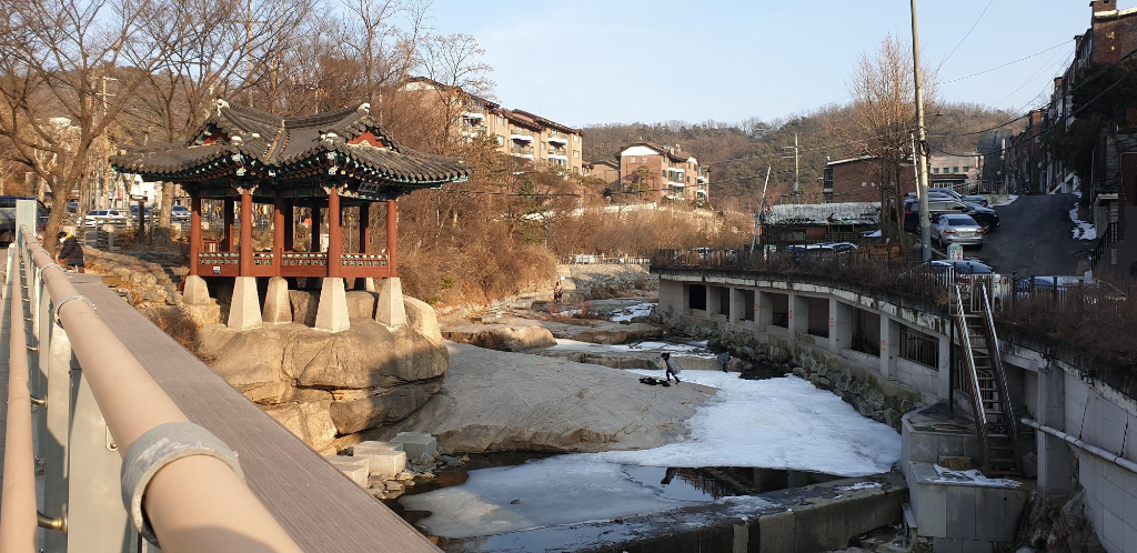 세검정이 있는 곳은 인왕산에서 물이 흘러내려 이루는 홍제천의 상류이다. 그늘진 곳이라 물이 얼어 있어 아이들이 그 위를 지치며 놀고 있었다. 조선 시대 양반들은 경치가 좋은 곳이면 꼭 정자 하나씩은 세워 놓고 거기에서 풍류를 즐겼다고 한다. 지금에야 제방이 세워져 있고 그 위에는 차로가 놓여 있는 곳이라지만, 그럼에도 불구하고 기암괴석들이 깔려 있는 계곡가에 세워진 세검정의 모습은 제법 운치 있었다. 산 너머 서촌에 살았다던 송강 정철이 <장진주사>에서 '꽃 꺾어 산 놓고 무진무진 먹세그려'라고 읊었던 곳이 바로 이 곳이 아닐까 하는 나름대로의 상상도 해 본다.