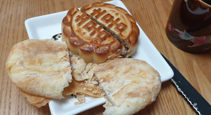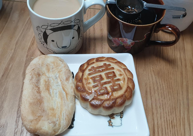 아니나 다를까, 집에 도착해서 월병을 선물이라고 내미니 아내의 반응은 뜨뜻미지근했다. "아 그래?" 정도. 우리 부부 둘 다 정말로 큰 기대를 하지 않았던 것이다. 멍하니 뒀다가는 언제까지고 집에 둘 것만 같아서, 마침 일요일 아침을 늦게 먹은 김에 약간 성대한 간식 삼아서 한번에 먹어 보기로 했다. 나는 모카포트로 커피를 내려 준비했고, 아내에게는 따뜻한 호지차 한 잔을 타 주었다. 중국 과자니까 아무래도 차가 어울릴 것이라는 계산이다.