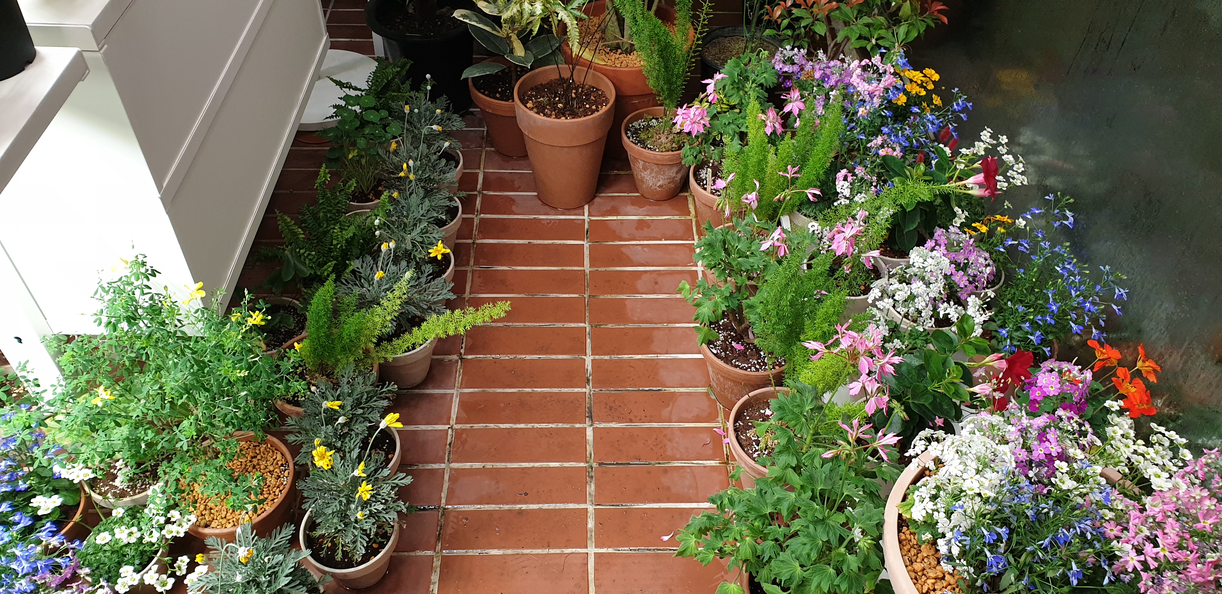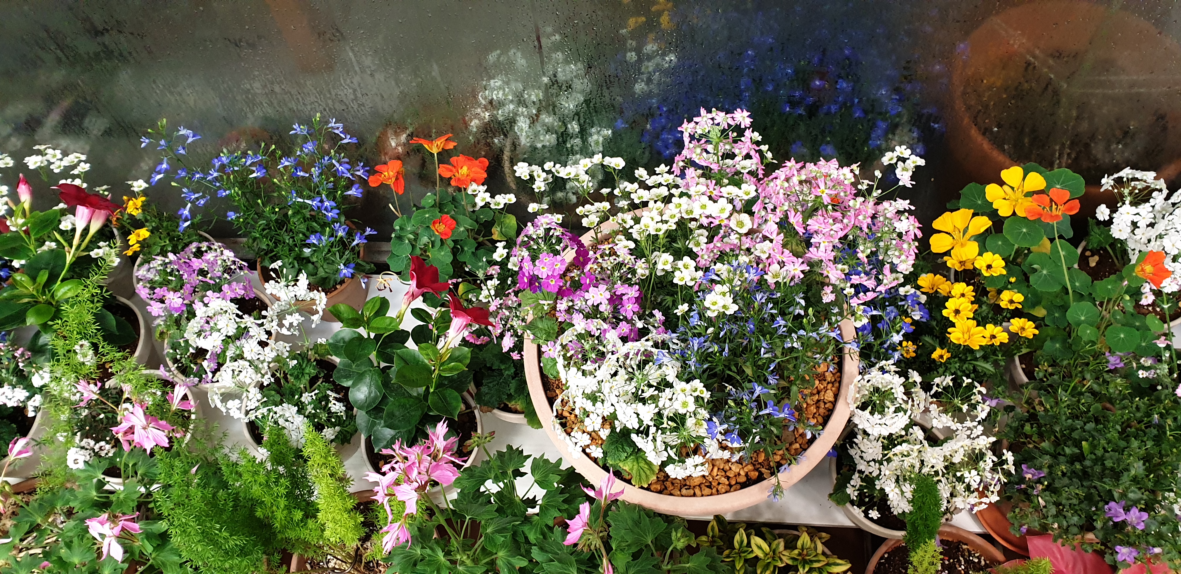 새삼스레 이렇게 다양한 꽃이 있었던가? 싶을 정도로 형형색색의 화사한 꽃들이 창가를 향해 피어 있었다. 주로 앵초류인 것 같기는 한데, 정확한 명칭을 모르니 답답하다. 사이사이에 숨어 있는 여우꼬리 모양의 아스파라거스 같은 풀들도 눈에 띈다. 밝은 색의 꽃들 사이로 푸르른 이파리들이 빼꼼 얼굴을 내미니 조화가 아름답다. 작은 우산 같은 이파리에 울긋불긋 꽃을 피우는 한련화도 눈에 띈다.