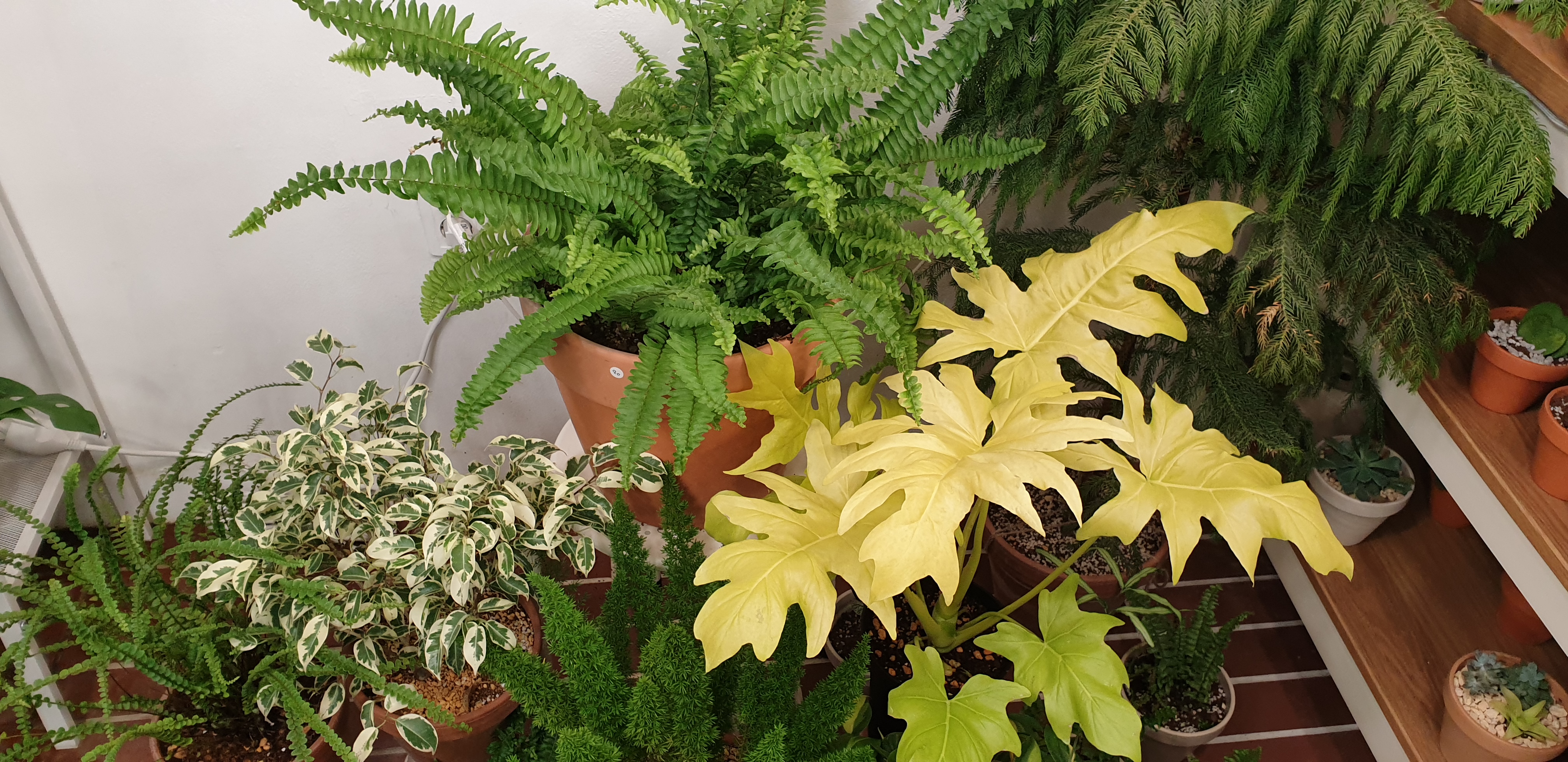 발디딜 틈 없어 보이지만 생각보다 사람의 운신할 폭은 무척 잘 뚫려 있는 독특한 느낌의 공간이었다. 선객들에게 사장님이 식물들에 대해 자세하게 설명해 주시는 것을 한 귀로 들으며 식물들을 구경했다. 아내가 좋아하는 느낌의 다글다글한 페페류가 특히 많이 보였다. 수박 페페, 거북이 페페, 픽시라임 페페, 나폴리나이트 페페, ... 아름답게 이파리를 늘어뜨린 아디안텀 고사리, 가운데에 고상한 느낌의 흰빛 줄무늬를 그려넣은 듯한 벨벳 싱고니움 등이 무척 건강한 느낌으로 식재되어 있었다. 행잉으로 키워지고 있는 아이비와 콩란, 선인장류, 호접란 등도 신선했고, 제법 큰 나무류와 고사리류도 있어서 공간 안에 조화로움이 돋보이는 느낌이었다.