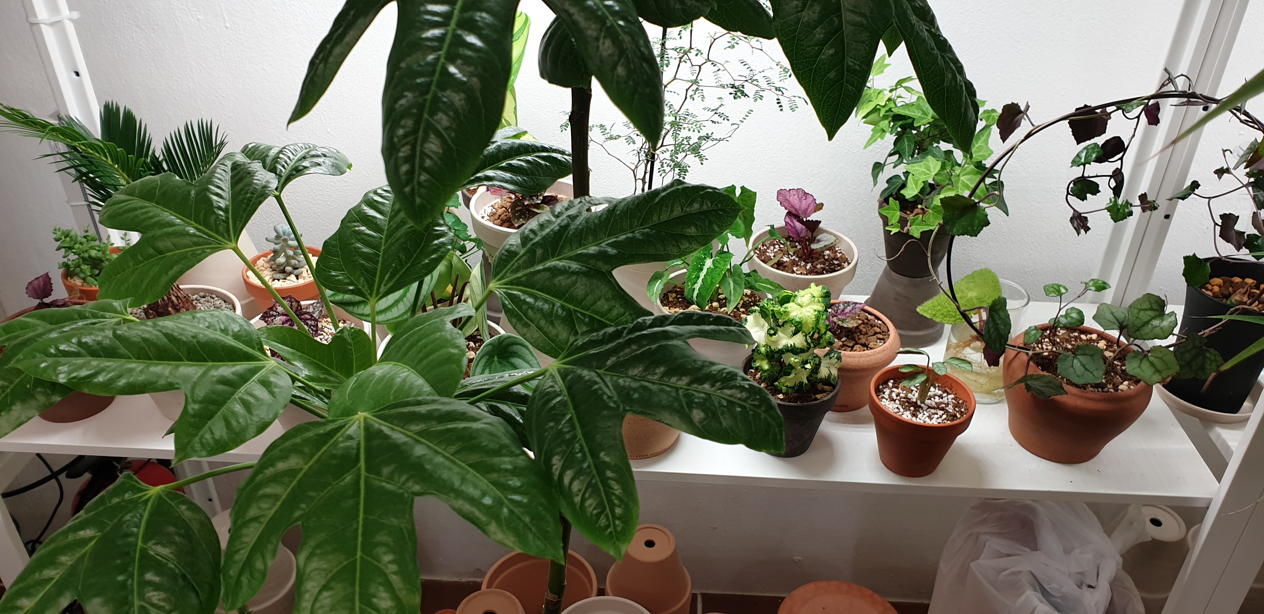 밖에서부터 느껴지는 이 압도적인 습기. 위에서 인용한 트윗의 타래에 따르자면 이건 전부 사장님이 열심히 분무해서 만드시는 습기라고 한다. 도대체 얼마나 분무를 해야 이 정도의 습기가 저 정도의 넓이에서 가능한 걸까. 사실 사장님은 인간 분무기가 아닐까. 그런 생각을 하면서 가게 앞을 둘러본다. 밖에서 빛을 충분히 봐야 잘 살 수 있는 라벤더와 로즈마리, 아카시아와 유칼립투스 같은 녀석들이 예쁜 화분에 잘 식재되어 있다. 옆에 뜬금없이 놓여 있는 상추 모판은 뭘까? 이런저런 이야기를 하며 안으로 들어간다. 이미 선객이 있어서, 일단은 가게 안을 죽 둘러보기로 한다.
