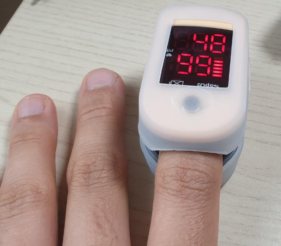 손가락을 이 집게처럼 생긴 기계 안쪽까지 잘 밀어넣으면 알아서 측정기가 손가락을 문다. 위 사진에 표시되어 있는 안쪽 격벽까지 손가락 끝을 밀어넣어야 한다. 사용설명서에는 딱히 어느 쪽의 어떤 손가락을 쓰라는 얘기는 없기 때문에 아무거나 편한 손가락을 쓰면 되고, 얼마나 오랫동안 봐야 한다는 기준도 없다. 그냥 측정 동안에는 움직이지 말고 말도 하지 말고 가만히만 있으면 알아서 측정이 된다. 피측정자 기준으로 보았을 때 상부에 표시되는 숫자가 맥박수, 하부에 표시되는 숫자가 산소포화도이다. 일산복음병원 자료에 따르면 산소포화도가 95% 밑으로 내려가면 저산소증 주의 상태가 되고, 90% 이하면 정말 위급한 상태가 된다고 하니 참고할 만하다. 측정해 보니 나는 그래도 대략 98-99% 정도에서 유지되는 듯하다. 다만 이미 알고 있었던 대로 맥박수는 정말 낮다.
