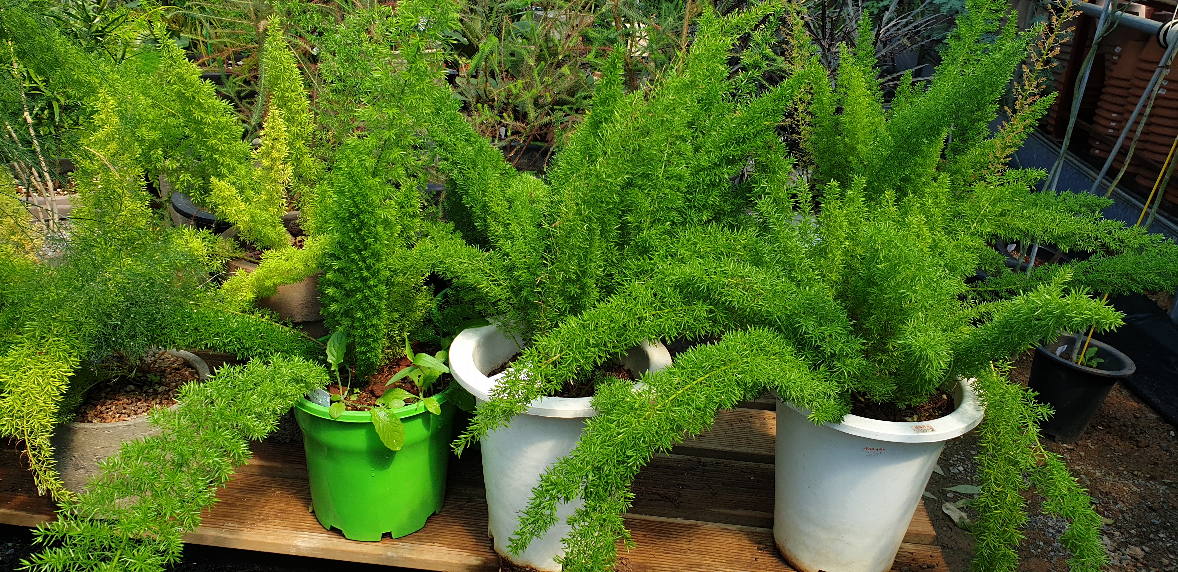 조금 더 들어가면 나무류나 덩치 큰 아스파라거스도 눈에 띈다. 율마는 집에서 이미 두 그루를 죽여 봤기 때문에 크게 욕심은 나지 않지만, 형광빛이 도는 저 연둣빛 이파리를 보면 괜스레 기분이 좋아진다. 여우꼬리처럼 늘어지는 아스파라거스도 예쁘다. 아스파라거스는 이 녀석들뿐만 아니라 다양한 종류가 있었다.