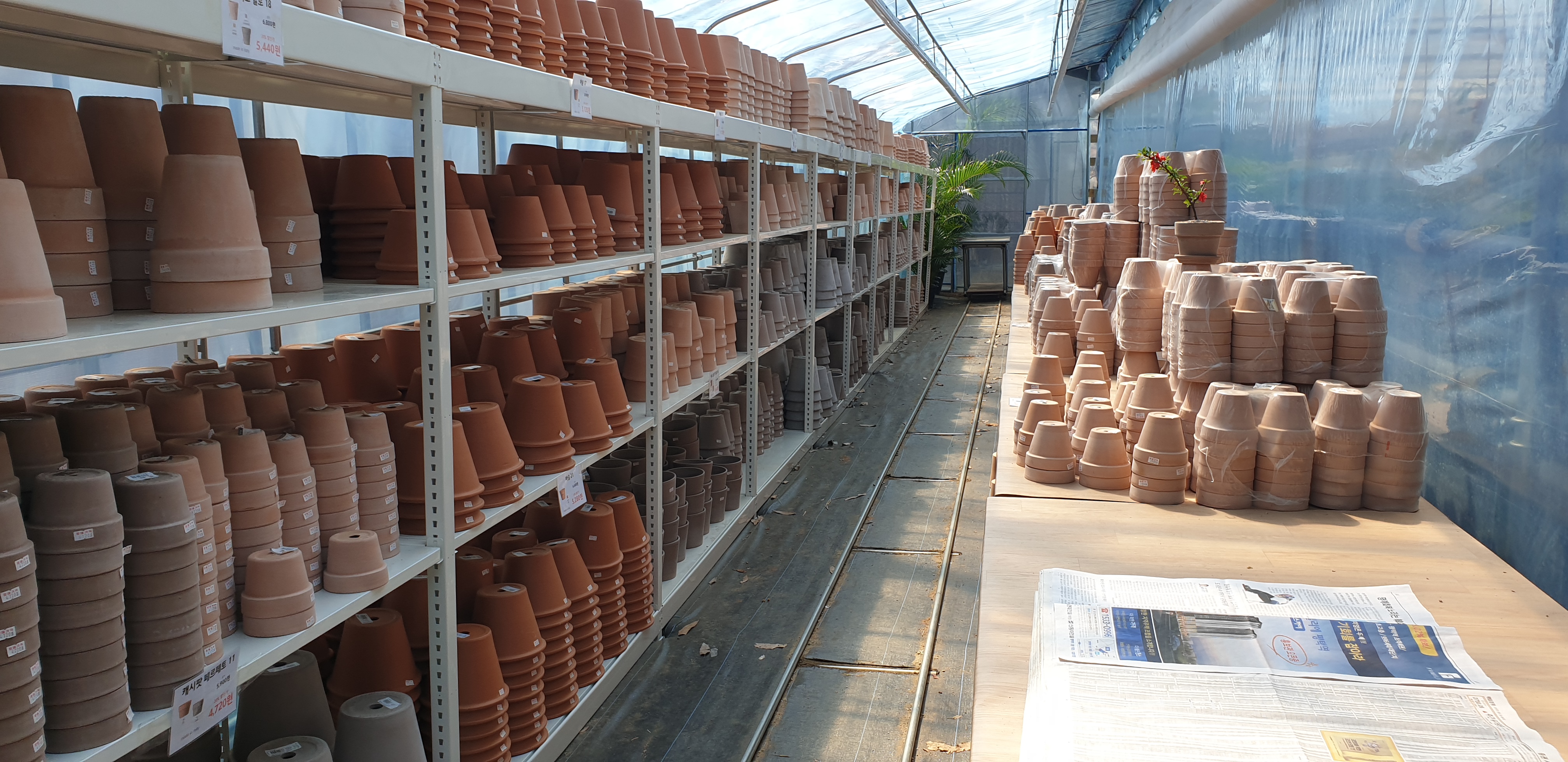 물론 화훼 자재도 갖춰져 있다. 살짝 구색 맞추기 같다는 느낌을 지울 수 없기는 한데, 그래도 분재용 자재들인 난석이나 적옥토 같은 것들은 준비되어 있다. 그보다도 더 볼만한 것은 한켠에 자리잡은 토분 진열장이다. 양쪽으로 끝이 잘 안 보일 만큼 늘어서 있는 다양한 크기와 모양의 토분들이 전시되어 있는데, 집에서 보통 쓸 만한 사이즈의 토분들은 물론이고 엄청난 사이즈의 녀석들도 준비되어 있어서 이런 큰 토분들이 필요한 사람에게는 제법 어필할 만한 공간이라는 생각이 들었다.