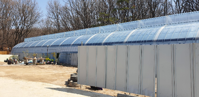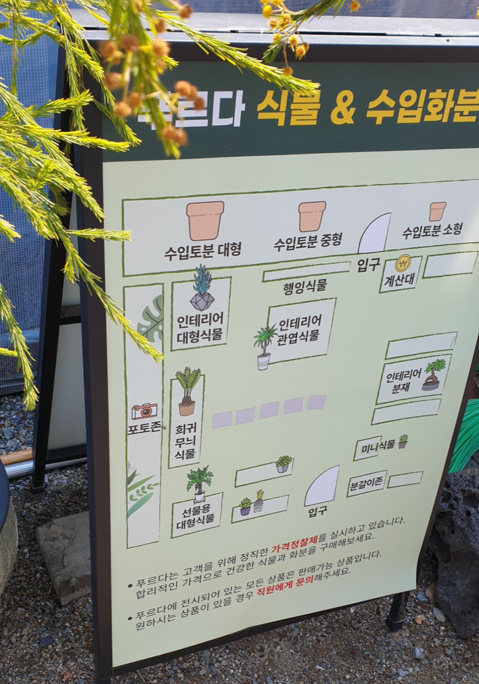 가게 부지 안으로 들어가면 건물이 두 동 있다. 왼쪽은 인테리어 컨셉트를 잡을 수 있도록 화분 등을 팔고 있는 공간이고, 오른쪽은 식물과 토분을 팔고 있는 비닐하우스이다. 사장님이 분재를 오래 하셔서 기본적으로는 분재원의 역할도 겸하고 있는데, 그래서 그런지 비닐하우스로 들어가는 문 앞에는 멋지게 수형이 잡힌 분재들이 여럿 진열되어 있었다. 다른 가게와 구분되는 '푸르다'의 정체성을 여실히 보여주는 곳이라고 하겠다. 비닐하우스 문 오른편에 서 있는 안내 입간판을 한 번 훑어보고 안으로 들어간다.