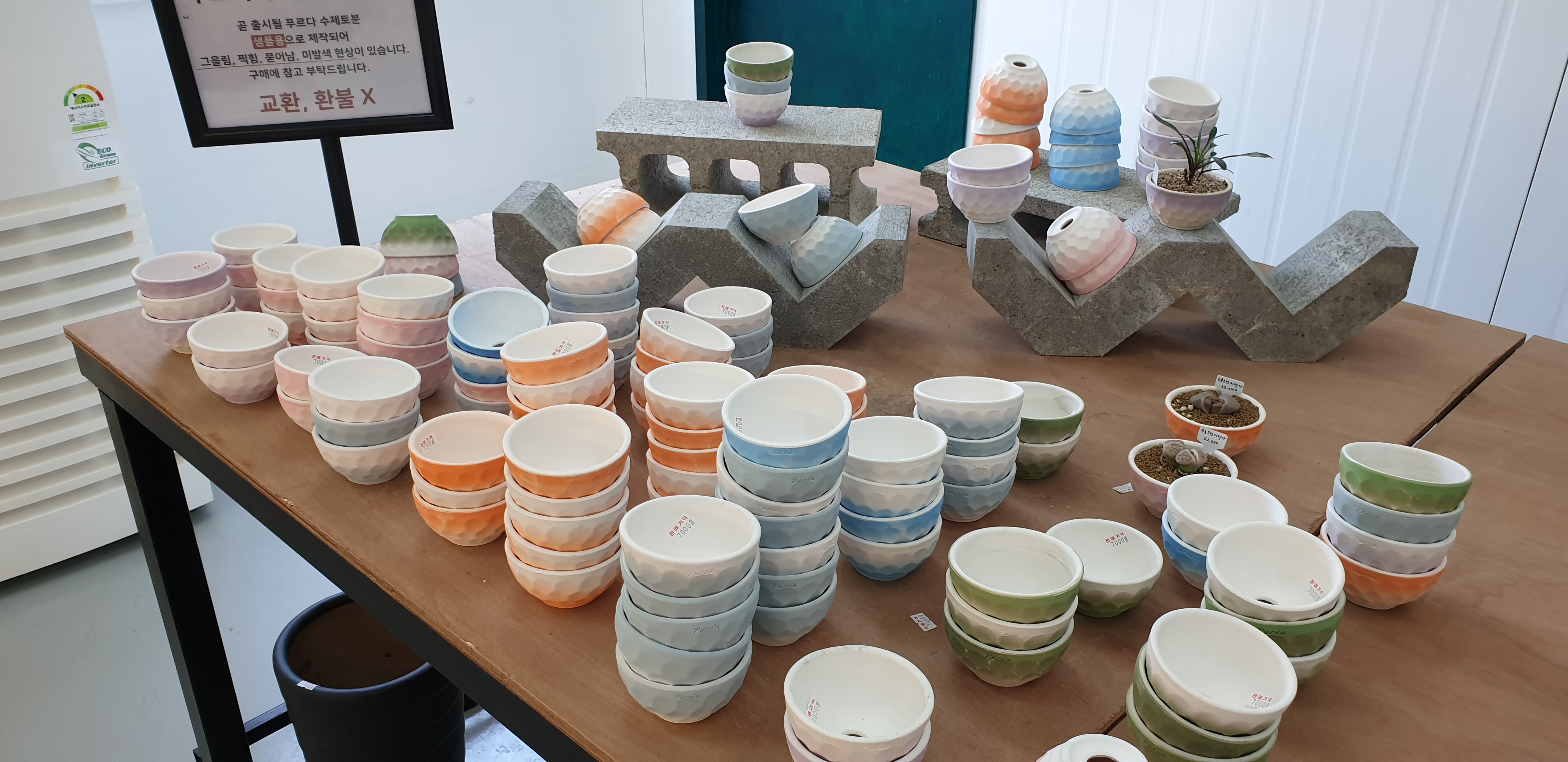 비닐하우스동에서 나와 건너편의 주황색 건물로 넘어가면, 여기는 주로 화분들을 팔고 있다. 나름대로 플랜테리어의 일부분으로서 다양한 형태의 화분을 제시하기 위한 공간인 모양이다. 제각기 다른 사이즈의 토분들과 세라믹 화분들이 팔리고 있는데, 아직 영 좋은 줄 모르겠는 빈티지 토분들도 좀 준비되어 있다. 여기에서 가장 나의 눈길을 끈 것은 마치 접시처럼 생긴 분재화분과 시제품 제작 과정에서 나온 하자품 토분들이다. 납작한 화분을 구하기가 쉽지 않다 보니 이렇게 예쁘게 생긴 납작 화분들을 보면 홀린 듯이 구매하게 된다. 결국 색이 입혀진 하자품 토분들을 두 개 구매했다. 이 녀석들은 나중에 벌레잡이제비꽃을 번식해서 키우거나, 아니면 걷잡을 데 없이 번식하고 있는 천손초들을 좀 담아서 키울까 싶다.