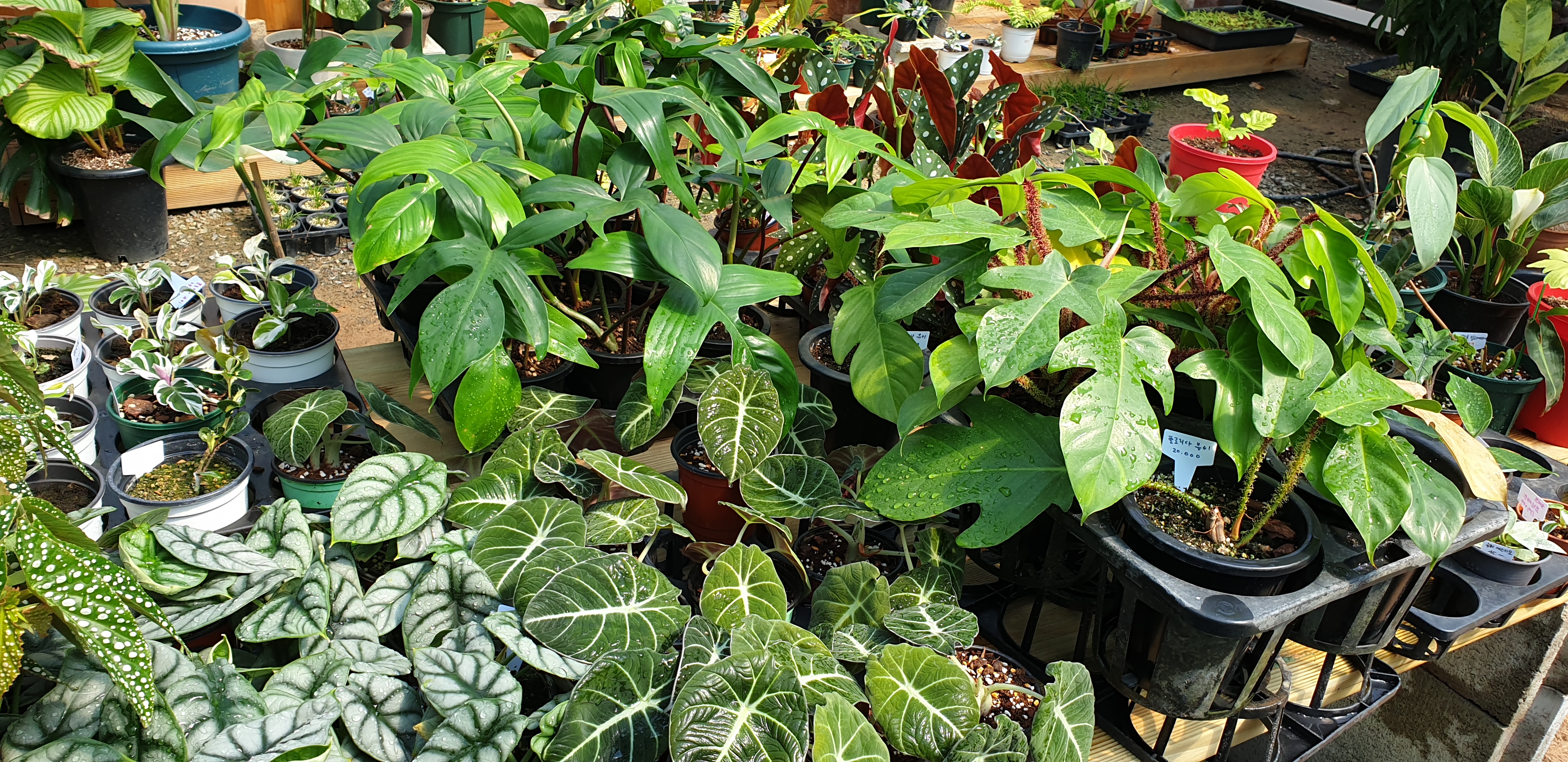 아카시아 존을 지나 조금 더 들어가면 보통의 화원에서 찾아보기 힘든 관엽식물들이 모습을 드러낸다. 필로덴드론류나 마란타과의 식물들은 이름은 많이들 알려져 있지만 막상 화원에서는 구하기 힘든 경우가 많다. 그야말로 조인폴리아 같은 큰 화훼단지에 가지 않는 한 대량으로 판매되는 것을 보기란 쉽지 않다. 그래도 최대한 다양한 품종을 조금씩이나마 가져다 놓으려고 노력한 티가 났다. 식물들의 상태도 하나같이 괜찮은 편이다. 알로카시아 실버드래곤이나 필로덴드론 플로리다 고스트, 크테난테 루베르시아나, 필로덴드론 실버메탈, 칼라데아 퓨전 화이트 같은 녀석들이 옹기종기 진열되어 있는 모습이 귀엽기 짝이 없다. 베고니아는 종류가 많지 않지만, 의외로 중품 정도의 필로덴드론류가 제법 준비되어 있어서 다소 놀라웠다. 제일 재미있는 것은 '무늬 송편'이라는 이름이 붙어 있는, 정말 송편같은 이파리를 가진 괴상한 식물이었는데, 나중에 찾아보니 '호야 임브리카타Hoya imbricata'라는 식물이라고 한다. 호야속의 식물들은 정말 제각기 너무 다르게 생겨서 도통 적응이 안 된다.