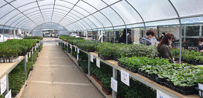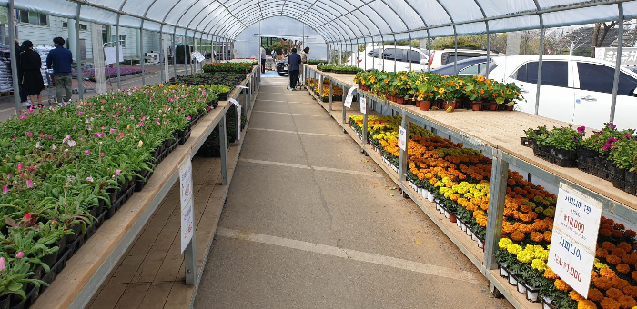 본격적으로 봄철이다 보니 화훼센터 바로 앞에 아예 하우스를 치고 모종을 잔뜩 팔고 있다. 하우스 안에는 판떼기로 파는 모종들, 하우스 밖에는 낱개로 사 갈 수 있는 모종들을 늘어놓은 형국이다. 그 탓인지 하우스 밖에는 사람들이 바글바글한데 하우스 안에는 통 사람이 없다. 그도 그럴 것이 아무리 주말농장을 시작하기로 마음먹은 이들이라도 당장 한 판에 십수 개씩 들어 있는 모종을 판떼기로 가져갈 엄두는 나지 않을 것이기 때문이다. 보통 주말농장을 처음 분양받은 사람들은 상추도 키워먹어 보고 싶고, 고추도 키워먹어 보고 싶고, 이런저런 작물을 다양하게 치고 싶어하는 경우가 많다. 도시농업에 열심인 우리 부모님 덕에 주말농장이라면 이골이 난 우리 식구들 정도는 돼야 모종을 판떼기로 사갈 생각을 하겠지. 늘 느끼지만 농사 또한 규모의 경제라서, 한 작물을 한 번에 싹 심어서 키우고 싹 뽑아 버리는 것이 관리도 훨씬 편하고 수확도 좋은 편이다. 몇 평도 안 되는 주말농장 밭뙈기에서 그런 걸 따지고 있을 계재는 아니기는 하지만.