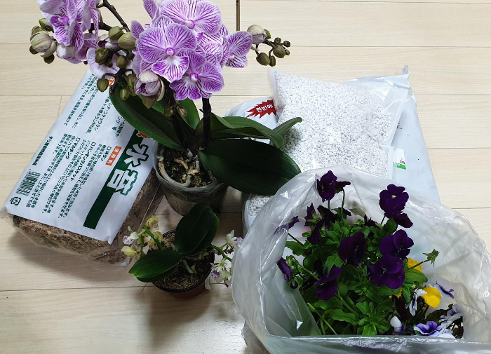 그래서 오늘의 전리품은, 칠레산 수태 한 팩과 꽃이 핀 나도풍란 한 촉(향이 제법 강하다! 시트러스 계열의 톡 쏘는 향이 난다), 아내가 지난번부터 눈독을 들이던 교배종 호접란 한 촉, 그리고 뜬금없게도 하나로마트 앞에서 좌판을 깔고 팔고 있던 비올라꽃 세 촉이다. 비올라는 팬지의 한 종류인데, 꽃을 식용할 수 있다는 것을 최근에 알게 되어서 한번 사보고 싶다고 생각하던 차였다. 한 촉에 고작 칠백 원밖에 안 하는데야 사지 않고 어떻게 배겨. 참고로 몬스테라 델리시오사도 한 촉에 천구백 원 정도에 팔고 있었는데(이 말도 안 되는 가격을 보라지!), 녀석을 사들였다간 진짜로 집이 작살날 것 같아서 뇌에 힘을 주고 참았다.