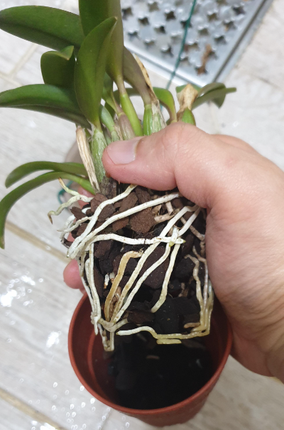 이번에 내가 사 온 카틀레야는 딱 보기에도 질이 괜찮아 보이는 자잘한 바크에 심겨져 있었다. 한 번도 써 보지는 않았지만 이름은 익숙한 오키아타 바크가 이건가? 싶기도 하고. 물론 바크에 키우는 것은 아주 정석적인 서양란 식재법의 하나이고 아무런 문제도 없지만, 나는 그저 부작을 연습해 보고 싶었을 뿐이다. 뿌리에 붙은 바크 조각을 정리한 뒤, 개중에서썩은 뿌리가 있는지 확인하고 제거해 준다. 보통 중심으로부터 가까운 뿌리들은 이미 오래 돼서 삭아 버린 경우가 많다. 호접란을 봐도 비슷한 경우가 많다. 이 카틀레야의 경우에도 대부분의 뿌리가 멀쩡했지만, 중심부 근처의 뿌리들이 살짝 삭아 있어서 그것들은 잘라내어 제거했다.