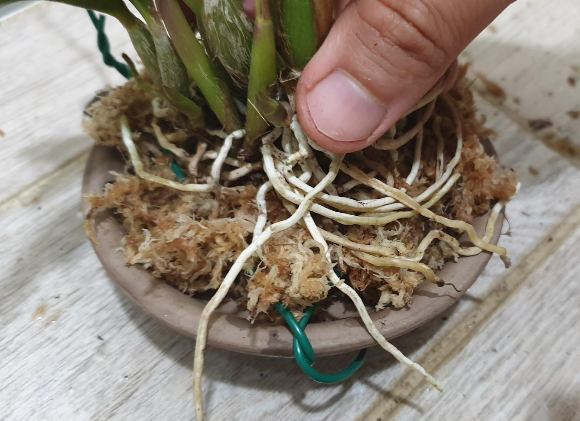 5. 화분받침 위에 수태를 깐 뒤 카틀레야를 얹는다(수태를 더 얹어도 된다).