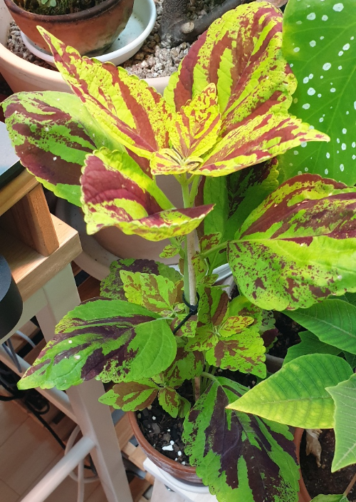 한동안 꽃대만 미친 듯이 올려 주던 러스틱 오렌지는 한번 강전정을 해 줬더니 새로 이파리들을 많이 쏟아내 주고 있다. 잎 색이 다소 우중충해지기는 했는데, 아무래도 식물등에서 너무 가까이 있었던 나머지 발색이 다소 어두워진 것이 아닌가 싶다. 최근에는 월간화원에 갔다가 콜레우스를 많이 들여놓으신 것을 보고, 그 중에서 페인티드 레이디 품종을 하나 구매하기로 했다. 그 날 어쩐지 이것저것 사고 싶어서, 아래에서도 언급하게 될 몇몇 식물들과 같이 이 녀석을 샀는데, 페인티드 레이디 말고도 품종이 생각보다 다양했다. 콜레우스가 키우기 쉽고 잎이 예쁘기는 하지만 품종을 다양하게 들여놓는 경우는 잘 없고 기껏해야 (내가 좋아하지 않는)'차이나 로즈' 품종만 화원에서 주구장창 봐 왔는데, 여기는 '차이나 로즈'뿐 아니라 '페인티드 레이디', '컴뱃', 그리고 이름을 알 수 없지만 어쩐지 러스틱 오렌지와 비슷한 느낌의 무늬를 가진 품종까지 네 종류는 진열되어 있었다. 다른 데라면 몰라도 월간화원에서는 식물을 사 왔을 때 쓸데없이 병충해가 묻어 오는 일이 없었기도 하고, 이렇게 다양한 콜레우스를 구하기 쉽지 않다는 것을 경험상 잘 알고 있었기 때문에 각 품종의 가격을 꼼꼼히 주인분께 여쭤 보았다. 아쉽게도 '컴뱃'은 뿌리가 덜 내려서 못 팔지만, 콜레우스를 좋아하신다면 덤으로 이거라도 어떠신가요, 하면서 다소 창졸간에 한 그루의 콜레우스를 더 얻게 되었다. 품종이 뭐냐고 물어봤는데 주인분도 모르신단다. 콜레우스는 워낙 품종명이 혼란스럽게 되어 있어서 파는 사람들끼리도 구분하기 쉽지 않다나. 약간 선짓빛이 도는 무늬가 나름대로 마음에 들어서 이 친구들도 열심히 키워 보고자 한다.