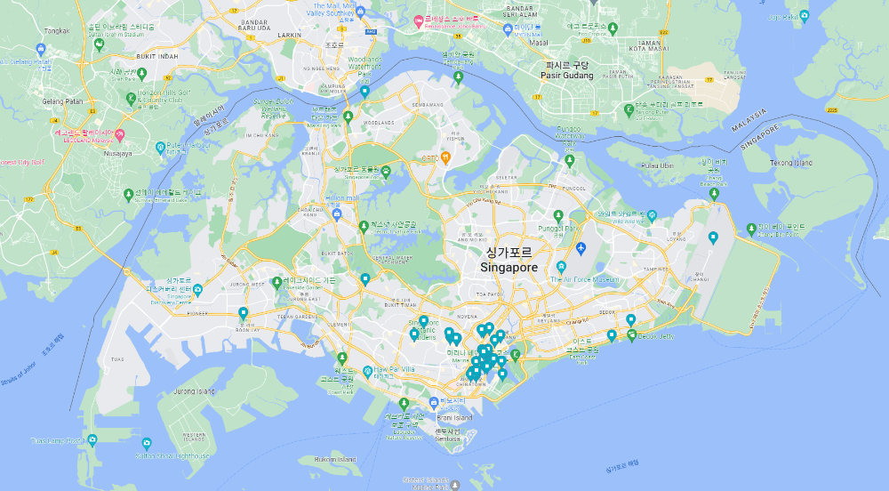 교보문고에 가서 싱가포르 관련 여행책자가 뭐가 있는지 뒤져 보았는데, 내가 간 지점에는 '프렌즈 싱가포르'와 '인조이 싱가포르' 두 권밖에 없었다. 연도도 똑같이 2021년 기준이고, 특별히 차이가 있을 것 같지는 않아 일단 둘 중 '프렌즈 싱가포르'를 한 권 집어 왔다. 이 책과 더불어, 아내가 열심히 찾아 준 싱가포르 미식정보 블로그를 뒤지면서 가 볼 만하다고 생각되는 곳들을 지도에 찍어 봤더니 대략 이런 그림이 나왔다.