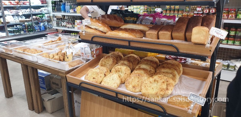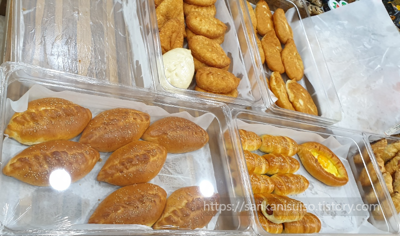 일단 안에 들어가면 제일 먼저 눈길을 끄는 것이 다양하게 진열되어 있는 빵이다. 납작한 중앙아시아식 식사빵부터 시작해서 네모난 식빵, 계란물을 발라 구운 바게트 비슷하게 생긴 빵 등이 가장 앞에 놓여 있다. 요즈음 빵이 워낙에 비싸서 프랜차이즈 빵집에서 빵을 사 먹으려 해도 기본이 3천 원 정도는 드는데, 일단 저 네모지고 큼직한 식빵 한 덩이가 2,500원이다. 바게트 비슷하게 생긴 길쭉한 빵은 브리오슈라는데, 팔뚝만한 빵 한 덩이에 이천 원. 납작한 빵도 2천 원부터 시작이다. 값이 싸도 너무 싸다. 혹해서 여러 개 사게 될 법한 비주얼이기도 하고.