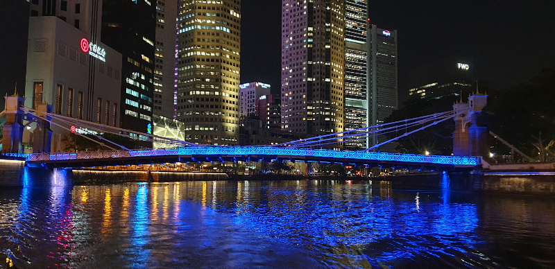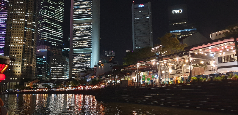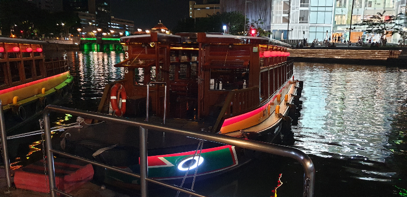 우리가 탄 보트는 싱가포르에서 옛날부터 사람들이 늘상 타고 다니던 전통 선박인 범보트(Bumboat)의 형태를 하고 있다. 커다란 곤돌라 같은 느낌의 배 위에 캐노피가 있고, 배의 이물과 고물은 뻥 뚫려 있는 형태의 선박이다. 누가 크루즈 아니랄까 봐 관광 포인트에 도달할 때마다 각 포인트의 역사와 이름의 유래 같은 정보들을 안내방송으로 열심히 틀어 준다. 아내는 좀 조용히 구경하고 싶어하는 티가 역력했지만, 나는 무척 흥미롭게 들으며 야경 구경을 했다.