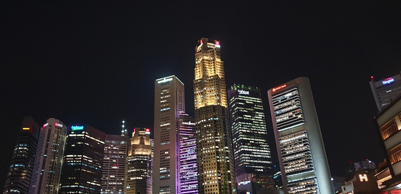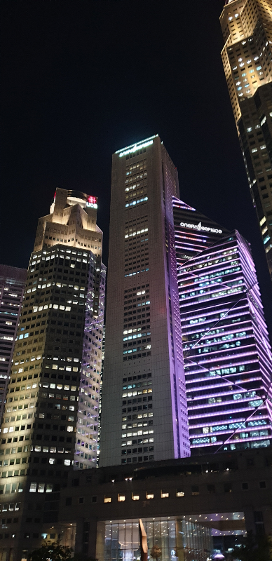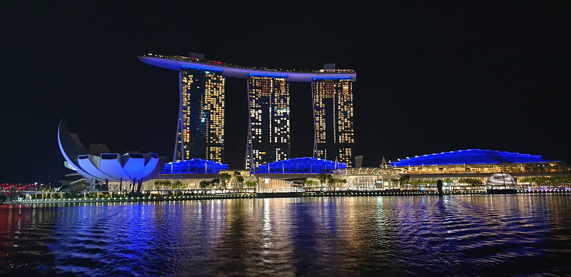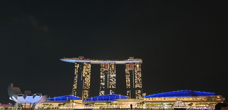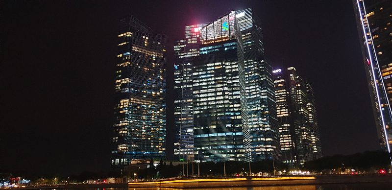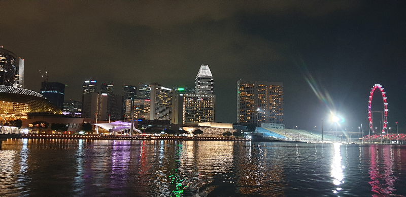 우리를 태운 보트가 마리나 베이를 한 바퀴 돌았을 때쯤, 드디어 마리나 베이 샌즈에서 뭔가 빛기둥 같은 것이 쏘아져 나오는 것 같았다. 이게 레이저 쇼의 시작인 모양인데, 아쉽게도 우리 배는 이미 마리나 베이에서 점차 멀어지고 있는 시점이었다. 그러나 그렇다고 해서 그 뒤로 엄청나게 화려한 느낌의 레이저 쇼가 보였는가 하면 사실 그것도 아니었다. 레이저 쇼를 자의 반 타의 반으로 구경하지 못하게 된 것은 살짝 아쉽기는 했지만, 야경이 너무나도 아름다웠던 나머지 크게 불만은 없었다. 아내의 개인적인 감상에 의하자면, 싱가포르의 건물들이 홍콩이나 시드니의 건물들보다 불이 좀 덜 켜진 것 같은 느낌이 들었다고 한다. 실제로 싱가포르의 잔업 비중은 생각보다 낮은 편이라고 한다. 남의 잔업을 구경하면서 잔업하지 말고 집에 좀 들어가라고 마음속으로 외치는 이율배반적인 태도를 취하기는 했으나 이 얘기를 듣고 나니 다소나마 마음이 놓인다.