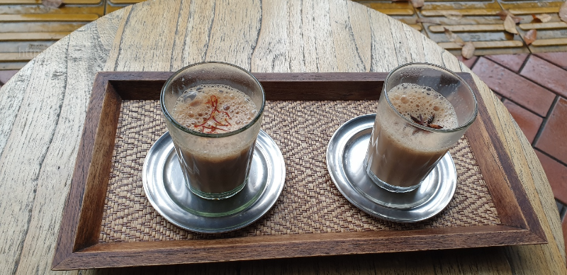 머지않아 사장님이 이렇게 예쁜 쟁반에 놓인 짜이 두 잔을 가져다 주셨다. 왼쪽이 사프란 짜이, 오른쪽이 마살라 짜이다. 위에 뭐가 올라갔느냐를 보면 대번에 구분할 수 있다.