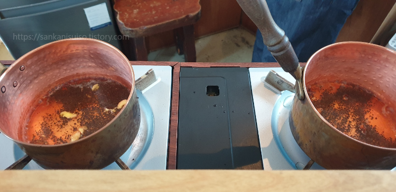 주문을 하는 즉시 사장님이 카운터 아래에 있는 황동 냄비에 향신료와 찻잎을 붓고 물을 부은 뒤 끓이기 시작한다. 만약 가게에서 먹고 가는 것을 선택한다면, 가게 앞에 펼쳐져 있는 의자에 앉아 있으면 사장님이 테이블로 짜이를 가져다 주시는 시스템이다. 짜이 끓이는 모습이 너무 궁금해서 조금 더 지켜보고 싶었으나, 우리 뒤로도 손님이 여러 팀 왔기 때문에 일단은 얌전히 철물점 앞 테이블을 끼고 앉아 짜이를 기다린다.