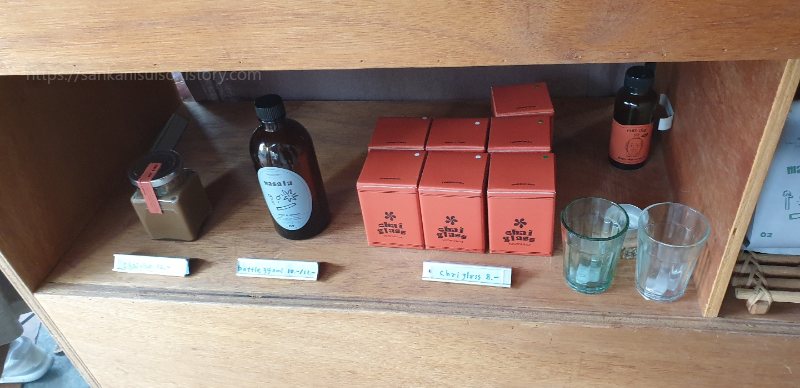 당장 마실 짜이를 주문하는 일 외에도 이 곳에서는 무언가 다양한 것들을 사는 행위를 할 수 있는 듯했다. 짜이와 곁들여 먹을 수 있는 비스코티는 물론이고, 병에 담긴 마살라 짜이, 짜이 잼(?), 그리고 이미 블렌딩된 짜이 찻잎도 팔고 있었다. 우리가 갔을 때에는 덕용 블렌딩 찻잎은 마살라 짜이밖에 없었지만 원래는 진저 짜이도 파신다고 한다. 과연 1회용 짜이 키트로는 진저 짜이와 마살라 짜이가 둘 다 있었다. 재미있게도 인도에서 실제로 짜이왈라들이 장사할 때 쓰는 것과 똑같은 유리제 짜이 잔도 팔고 있었다. 듣자하니 인도에서는 이렇게 생긴 유리컵 외에도 상당히 내구성이 약한 일회용 도기 잔을 사용하는 경우가 많다고 하는데, 다 마신 잔은 그냥 바닥에다 던지면 깨져서 다시 흙으로 돌아간다나 뭐라나.
