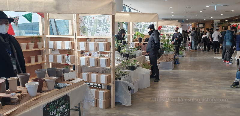 '식물문화센터'라는 곳에서 한다길래 어딘가 했더니 온실이다. 온실 건물의 1층과 지하1층을 합쳐서, 비어 있는 복도 공간을 활용해 여러 식물 관련 셀러들이 나와 식물과 화분, 상토, 액세서리 등을 파는 행사다. 공항철도 마곡나루역에서 내려서 완전히 겨울을 맞이한 서울식물원 야외정원을 터덜터덜 걷다 보면 온실이 나온다. 이리로 들어가면 된다. 밖은 누구 하나 코라도 베어갈 것마냥 싸늘한 겨울 바람이 살을 에이는데, 역시나 온실이라 그런지 실내로 들어가자마자 안경에 뿌옇게 김이 서리며 훅 따뜻한 온기가 끼친다. 역시 여름 피서는 은행이 최고고, 겨울 추위 피하기는 식물원 온실만한 게 없다.