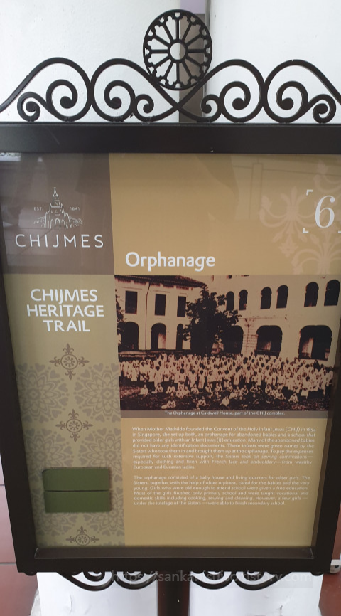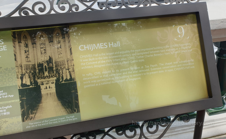 '차임스'라는 발음만 들었을 때에 섣불리 상상하기 어려운 'J'가 뜬금없이 철자에 들어가 있는 이유는, '차임스CHIJMES'라는 이름 자체가 줄임말이기 때문이다. 정확히는 '성스러운 아기 예수 수녀회 중등학교(Convent of Holy Infant Jesus, Middle Education School)'의 약자를 영단어 발음법으로 읽으면 '차임스'가 되는 것이다. 바로 길 건너에 싱가포르 대교구의 주교좌 성당이 있고, 조금 더 북동쪽으로 나가면 천주교 성당이 두 개나 더 있는 그야말로 가톨릭 밀집 구역이다 보니 이렇게 대규모의 수녀원 겸 학교 겸 고아원이 있었다는 것도 납득이 된다. 여기 있던 수녀회와 학교는 외곽의 주거단지인 토아 파요 쪽으로 이전했고, 건물만 남아 있던 것을 대대적으로 상업 구역으로 탈바꿈시킨 것이 지금의 차임스라고 한다.