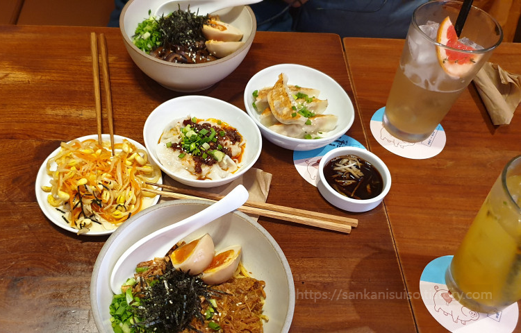 음식의 경우에는 뭐랄까, 우리가 여행에서 지향하는 식사에서는 다소 일탈했던 것이 문제였다고 생각한다. 전반적으로 봤을 때는 제법 어레인지가 잘 된 동아시아식 식사였다. 특히 버섯 미소비빔면이 정말 괜찮았다. 그러나 주문하고 나서 제일 먼저 나온 음식이 한국 식당에서 흔히 볼 수 있는 콩나물무침이었던 시점에서 '아, 잘못 들어왔나?' 싶은 생각이 들기 시작했다. 아니 물론 나도 좋아하는 반찬이기는 한데, 이걸 굳이 여행 와서까지 식당 밑반찬으로 먹고 싶지는 않거든. 면 요리는 다분히 일본식 마제소바를 지향하고 있었고, 구운 만두는 일본식으로 구운 교자, 물만두는 중국식으로 삶은 물만두의 느낌이었다. 어떻게 보면 한중일 삼국의 음식을 적절하게 어레인지해서 제법 괜찮은 맛으로 만들어 내놓고 있는 식당이기는 하지만, 싱가포르까지 와서 이만큼의 돈을 들여서까지 먹고 싶지는 않다는 것이다. 내가 현지에 거주하고 있는 사람이라면야 매력적인 식당으로 느껴질 수도 있겠지만. 아, 음료는 정말 맛있다. 적극 추천한다.