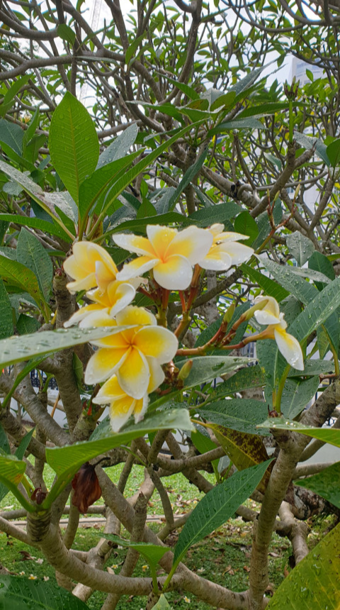 싱가포르는 참 꽃이 아름다운 도시다. 늘여름의 나라라서 그런가 어딜 가든 본 적 있는 꽃 본 적 없는 꽃을 막론하고 한 번은 길거리에 핀 예쁜 꽃을 구경할 수 있다. 요 녀석은 이파리는 망고같이 생겼는데 전혀 상관없는 협죽도과의 '플루메리아'라는 꽃이란다. 여름의 이미지를 그대로 형상화한 것 같은 아름다운 꽃이다.