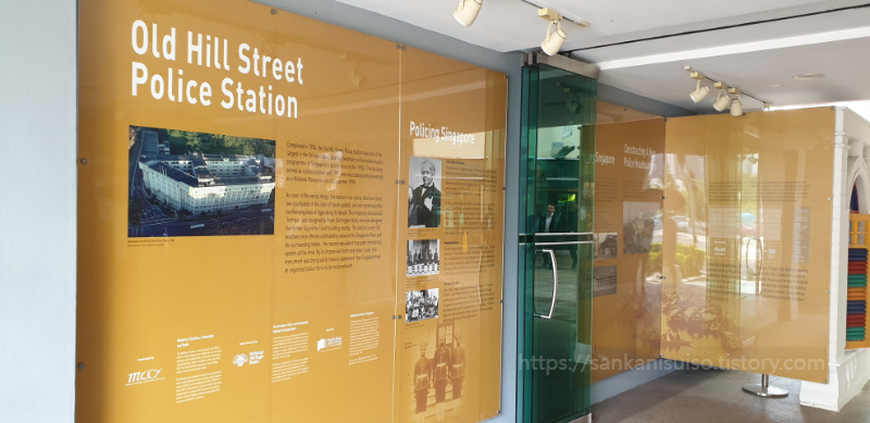 클락 키에서 바로 내다보이는 무지갯빛 창살로 유명한 '구 힐스트리트 경찰서' 건물 앞을 지난다. 여기는 지금은 정부 부처로 사용되고 있는 모양인지, 정문 앞에 '문화공동체청소년부', '커뮤니케이션 및 정보부'라고 쓰인 멋없는 현판 두 개가 붙어 있다. 대강 이 건물의 역사에 대해 적은 전시자료도 훑고 넘어간다. 낮 열한 시가 채 되지 않은 시간인데도 햇볕이 너무 강렬해서, 이 건물 현관에 잠깐 들어가 햇볕을 피하며 횡단보도 신호를 기다리는 사람들이 우리 말고도 몇 있다.