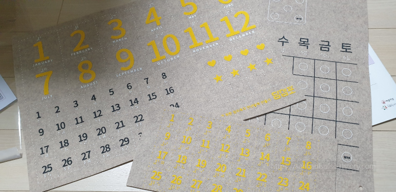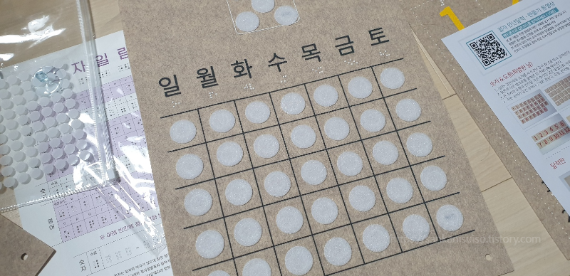 이번에 아내가 가져온 사회공헌 시리즈는 '점자촉각 만년달력'이다. 시각장애 어린이들을 위한 교육용으로 납품되는 교보재를 만드는 키트다. 간만에 공작 하는 기분 좀 낼까 싶어서 받아다 달라고 했는데, 그 뒤로 이런저런 바쁜 일들이 있어서 마감일 직전이 되어서야 아내와 함께 키트를 붙잡고 바닥에 퍼질러 앉았다. 슬슬 해 보자고.