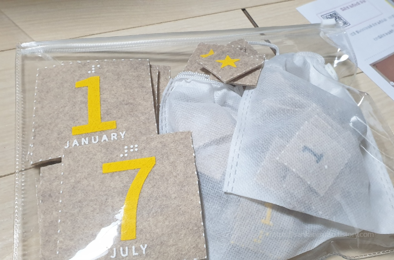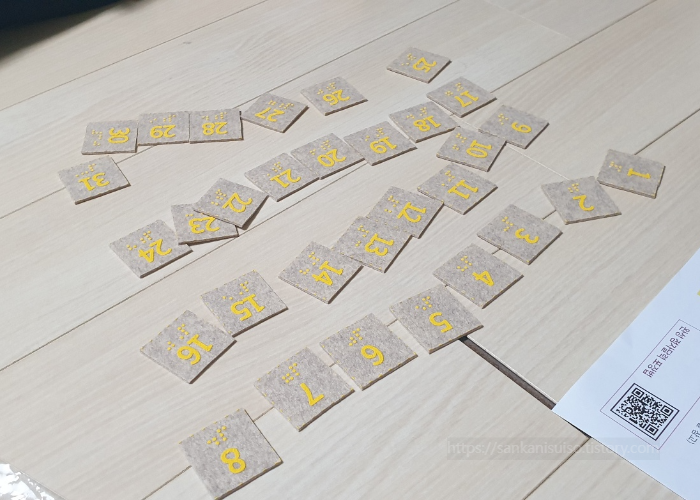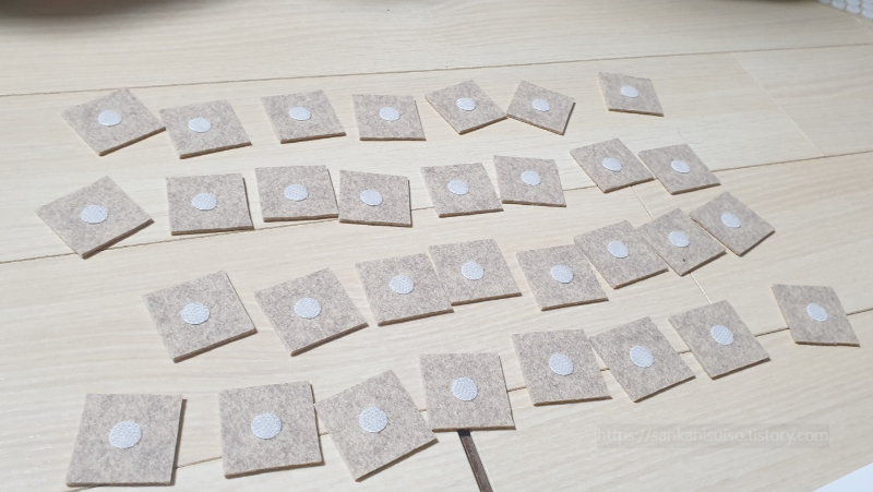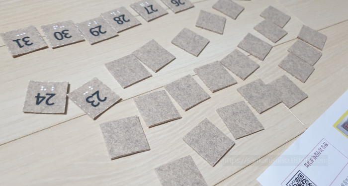 숫자 조각은 일단 날짜별로 쭉 늘어놓은 뒤, 하나하나 뒤집어서 놓고 벨크로를 붙여 나가는 것이 좋다. 날짜별로 늘어놓고 하나씩 뒤집는 것이 번거로울 수도 있겠지만, 개인적으로는 숫자 개수를 잘 맞추기 위해서는 이렇게 하는 게 편한 성싶었다. 나중에 세어 보다가 '어? 하나가 부족한데?' 이런 불상사가 일어나는 것보다는야 낫지 않겠는가.