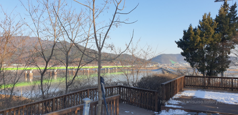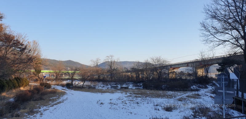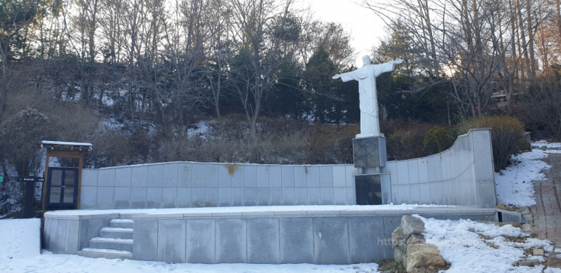 눈 덮인 길을 무작정 걸어가 보니 그 끝에 이렇게 탁 트인 공터와 함께 거대한 예수상이 나타납니다. 이쯤 되니까 성지성당이라는 느낌이 좀 나네요. 날씨가 좋을 때에는 여기에서 집회를 할 수도 있겠지만 이 한 겨울에는 어려워 보입니다. 여기에서 예수상을 마주한 채 왼쪽을 보면 산책로 안내판이 있는데, 구강화대교로 걸어올라갈 수 있는 산책로입니다. 지금은 구강화대교를 도보길로 쓰고 있는 모양이예요. 예수상 앞에 서면 이렇게 신강화대교와 구강화대교를 한번에 조망할 수 있기도 합니다.