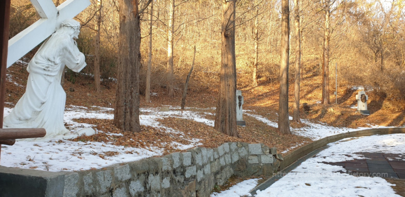 그 뒤로는 십자가의 길이 펼쳐져 있습니다. 부지가 넓은 성지 구역이다 보니 이렇게 야외에 순례할 수 있도록 십자가의 길을 조성해 둔 것입니다. 서울이라면 중림동 약현성당에 가면 비탈길을 따라서 이렇게 십자가의 길을 조성해 뒀습니다. 흥미롭게도 십자가의 길이 시작하는 곳쯤에 크고 작은 나무 십자가를 배치해 뒀습니다. 예수의 고난을 스스로 체험해 볼 수 있도록 준비해 둔 것인 모양입니다.