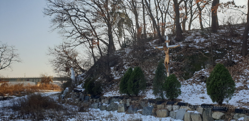 여기가 순교성지임을 알려 주는 표식 자체를 찾기란 쉽지 않은데, 한참을 주위를 둘러보다가 나무 사이에 숨어 있는 십자고상을 발견했습니다. 뒤로 성모상도 있고, 부지 뒤쪽으로 이어지는 듯한 길이 보입니다. 저리로 걸어가면 되겠거니 싶어서 무작정 발걸음을 옮겨 봅니다. 주위에 쥐새끼 한 마리 없어서 매우 오묘한 기분이 듭니다.