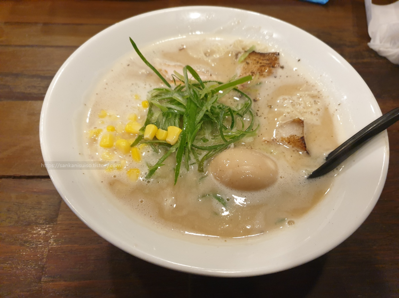 가게 문 바깥에 있는 키오스크에서 주문하고 나서 점원에게 티켓을 전달하면 주문이 들어가는 식이다. 가게 안에는 비교적 늦은 시간인데도 사람이 많이 있어서 사진을 찍지는 못했다. 다만 독자의 흥미를 위해 간략히 설명하자면, 요즘 많이 생겨나는 카운터석 형태의 라멘 가게다. 디귿자 모양의 카운터석이 가게 가운데에 있고, 직원이 그 가운데를 왔다갔다하면서 주문을 받거나 자리를 청소하는 식의 형태이다. 아내는 시오파이탄을 주문하고, 나는 미소라멘을 주문했다. 파이탄이란 한자로 풀이하자면 '백탕白湯'인데, 아마도 중국어식으로 읽었을 때의 발음인 '바이탕'을 일본식으로 옮긴 게 아닌가 싶다. 닭으로 끓인 육수인데 마치 사골마냥 국물이 뽀얀 것이 특징이다. 아닌 게 아니라 정말 사골마냥 닭뼈의 골수가 녹아나올 만큼 뭉근하게 끓여 만들기 때문이라고 한다. 이 가게에서는 소금(시오)으로 간하는 '시오파이탄'과 간장(쇼유)으로 간하는 '쇼유파이탄'을 팔고 있고, 그 외에도 매운 라멘과 미소라멘을 팔고 있었다. 미소라멘은 평소 웬만해서는 맛있게 하는 집을 찾기가 어려운데, 여기 미소라멘이 괜찮다는 후기를 읽고 혹해서 시켰다.