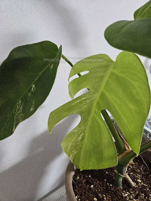 2022년 1월에 데려와 한동안 얼음 상태였던 몬스테라 알보는 지속적인 광조사를 통해 무늬를 끌어내는 실험을 하고 있다.