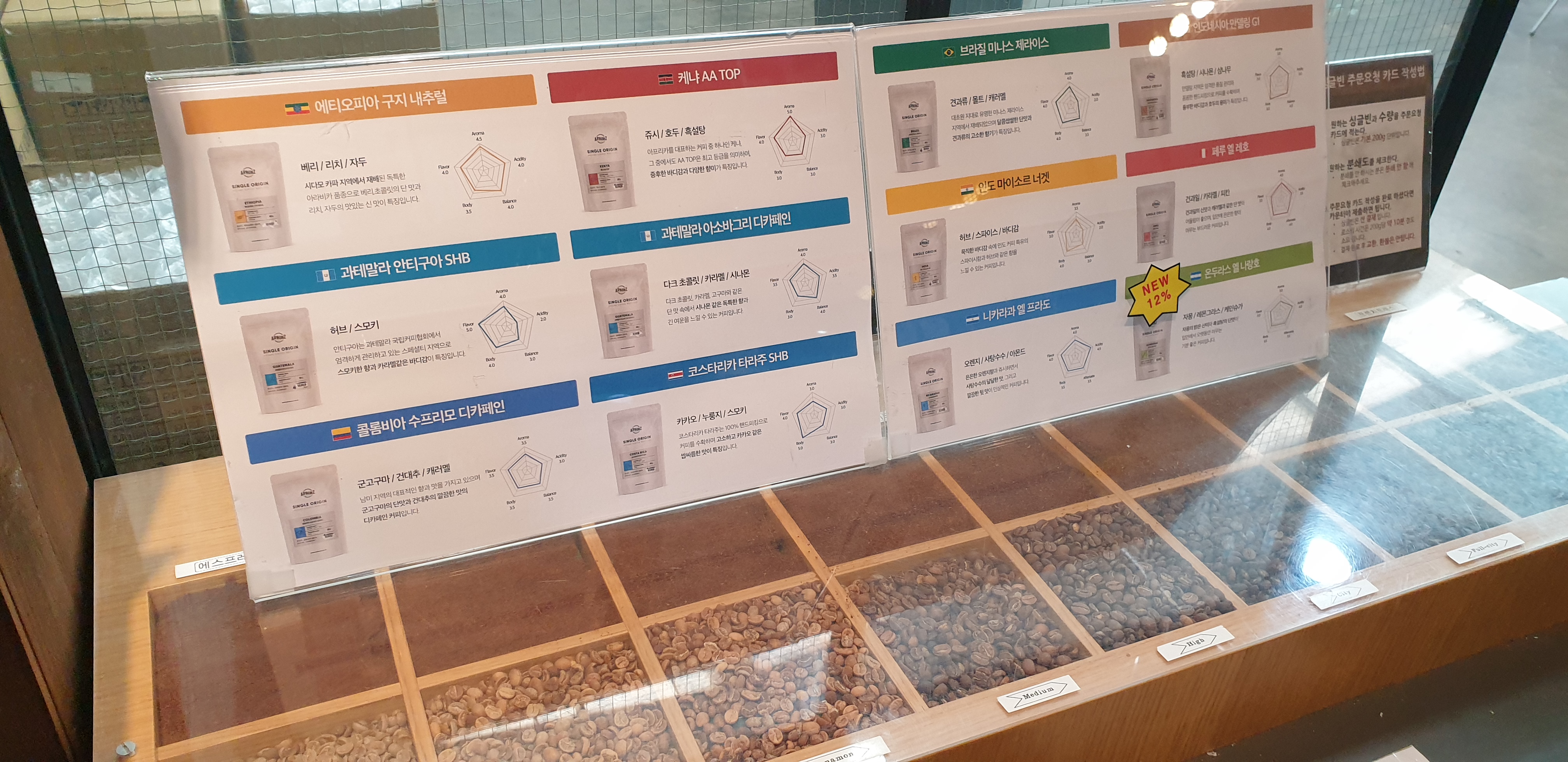 개방 공간을 지나서 진열 공간 안으로 들어오면 바로 압도적인 사이즈의 로스터기와 원두 진열장이 눈에 들어온다. 다양한 나라에서 온 생두들이 진열장에 전시되어 있고, 여기에서 원하는 원두를 골라 진열장 오른쪽에 비치된 주문서에 적어 요청하면 약 15분 후 갓 볶아진 원두를 받을 수 있다. 가스가 배출되기까지 1-2일 정도 둔 다음에 내려 마실 때 가장 맛있다고.