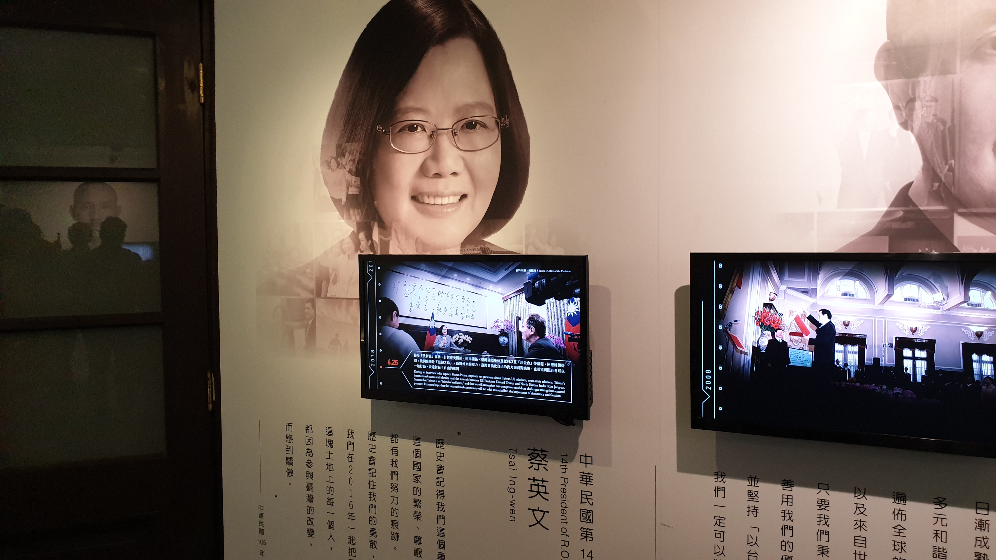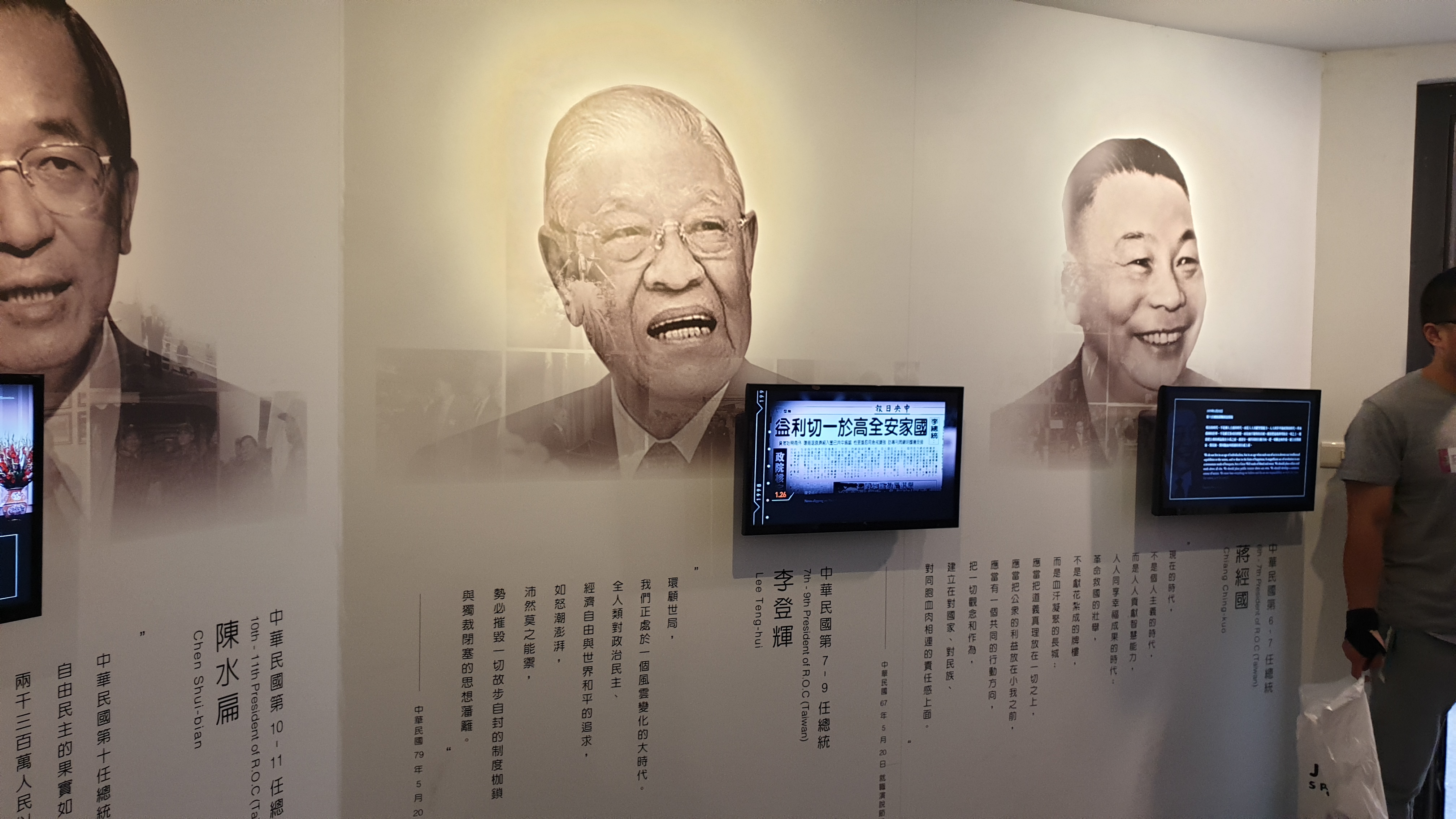 총통부 관광은 1층 복도를 따라 죽 돌아가는 형태로 조성된 전시실을 따라가며 진행되었다. 국부천대 이후 중화민국의 역사를 각 총통의 시대에 맞춰 구성해 두었고, 특히 일제 강점기의 역사에 대해서도 포용적인 태도로 서술되어 있는 안내문들이 눈에 띄었다. 타이베이가 비교적 최근부터 대만의 중심지가 된 도시인 덕인지는 몰라도, 총통부가 위치한 타이베이 중심부는 상당히 계획적으로 조성되어 있으며 한국처럼 오래 된 역사 유적지를 부수고 그 자리에 일본의 통치기구를 세우거나 하는 일이 상대적으로 적었다는 사실이 오늘날에도 일본식 건물을 유지하는 데에 상대적으로 거부감이 적은 이유 중 하나가 되지 않았을까 하는 추측을 해 보았다.