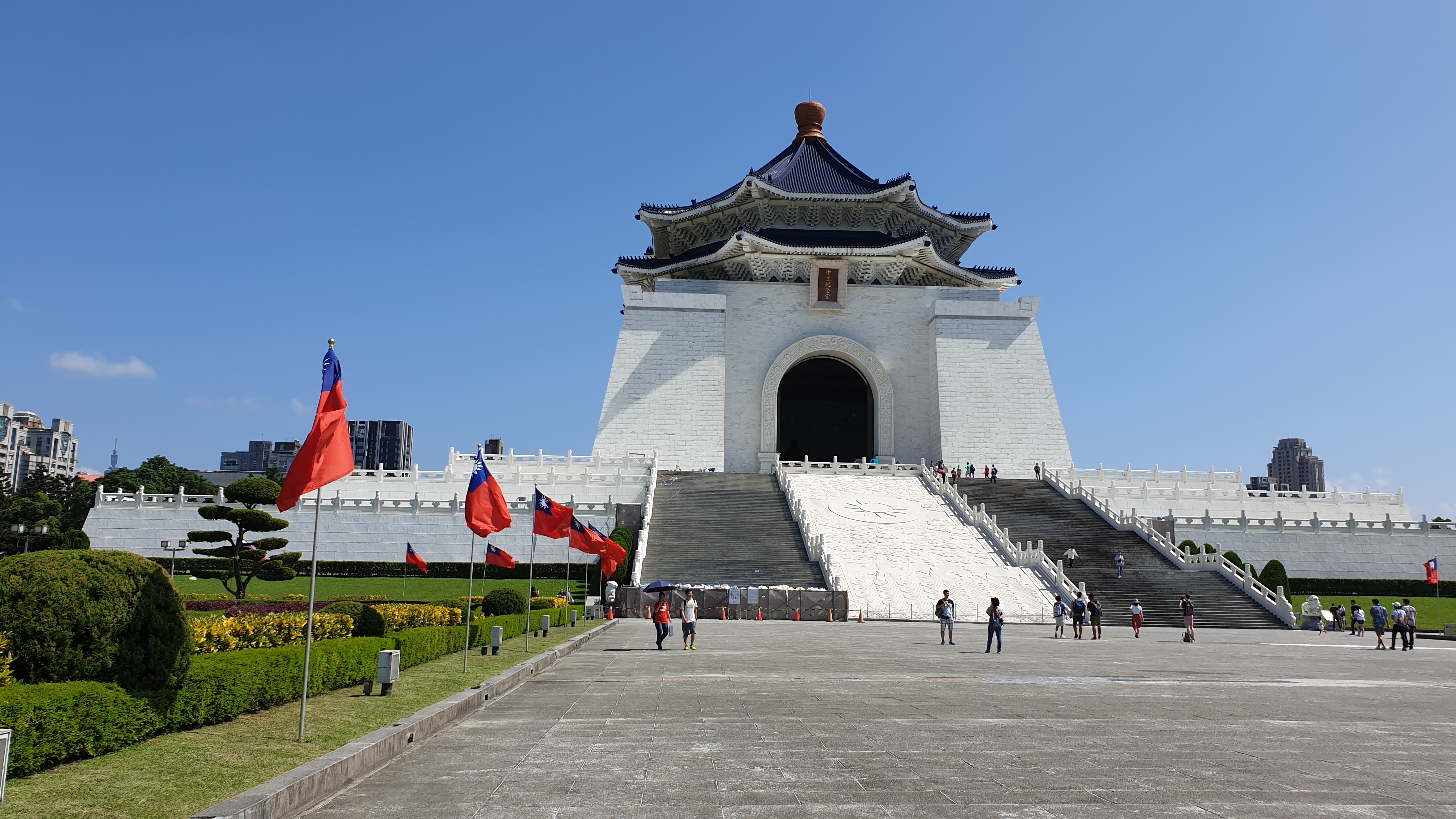 이전 포스팅에서 타이베이 기차역 이야기를 하면서 "대륙에서 쫓겨난 설움을 건물을 크게 지으면서 풀기라도 했던가"라는 언급을 했었는데, 그야말로 중정기념당이 그러했다. 실제로 총통을 비롯해 수많은 정부 관료들이 오가며 근무하는 총통부도 중정기념당 내 장제스 기념관 하나 크기에는 못 미치지 않을까 싶을 만큼 정말 거대하다. 순백 벽에 쨍하도록 푸른 청기와를 얹은 거대한 건물이 백여 단은 되는 계단 위에서 나무 하나 없는 광장에 서 있는 관광객을 내려다보고 있는 모습은 압도적이기까지 하다. 중정은 공과가 워낙 뚜렷한 사람이다 보니 대만 사회에서도 여러모로 논란의 대상인데, 특히 2019년 시점의 여당인 민주진보당은 민주주의를 탄압하고 중국인으로서의 정체성을 강조했던 중정에 대해 상당히 비판적이라 집권할 때마다 중정기념당의 격에 대해 재검토하려는 시도를 계속하고 있다고 한다. 멀리 갈 것 없이 같은 아시아 민주국가에 살고 있는 내가 보더라도, 아무리 국부라고는 하나 이렇게까지 일반 국민을 압도하는 형태의 건축으로 기념받을 필요까지 있는지에 대해서는 약간 의문이라는 생각이 들었다. 때가 되면 장제스 동상 앞에서 근위병 교대식 하는 것도 그렇고. 그럼에도 불구하고, 중정기념당 자유광장의 광경은 그야말로 아름다웠다. 너무 뙤약볕이라서 그렇지. 중화권 사람들은 왜 이런 데에 나무 심을 생각들을 도통 안 하는지 정말 알다가도 모르겠다.