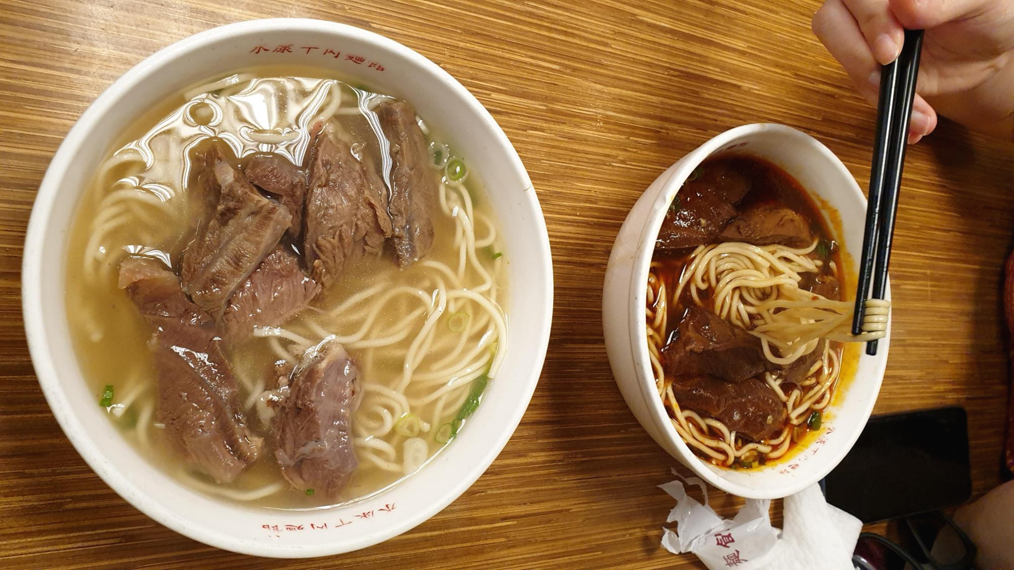 과연 얼마 지나지 않아 가게로 들어가서 주문을 할 수 있었고, 보편적으로 알려진 홍샤오우육면은 조금 맵다는 소리가 있어 매운 것을 못 먹는 나는 일단 백우육면을, 상대적으로 매운 것을 잘 먹는 아내는 홍샤오우육면을 주문했다. 국수집이니만큼 메뉴도 퍽 빨리 나왔다.