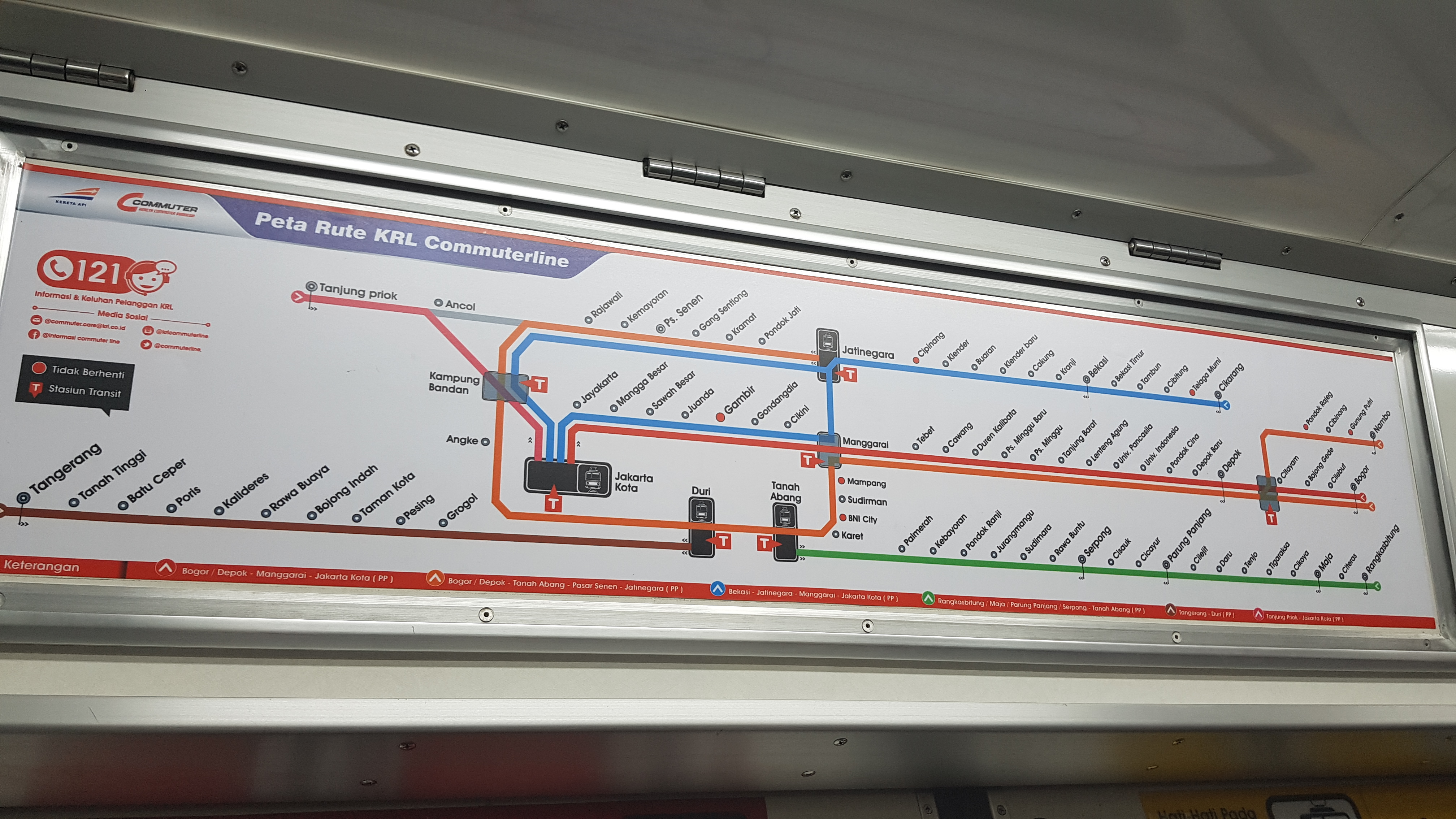 이 자카르타 전철이라는 것이 또 흥미롭다. 먼저 전동차와 승강장 사이의 단차가 상당하다. 사람 발목 하나쯤은 되는 단차이기 때문에 장애를 가진 사람이라면 남의 도움을 받아 올라탈 수밖에 없다. 또 객차의 생김새가 어딘가 눈에 익다. 도쿄를 자주 다닌 사람들이라면 예전에 간간이 도쿄 지하철에서 보았던 것만 같은 객차들이 중구난방으로 연결되어 있다. 실제로 자카르타에는 도쿄메트로에서 운용하던 전동차들 중 연한을 넘긴 것들이 다수 수입되어 현역으로 굴러다니고 있다. 도색만 새로 했을 뿐, 아직도 빛바랜 도쿄메트로 마크를 달고 달리는 객차들도 수두룩하다. 가장 재미있는 것은 객차 자동문 내부에 붙어 있는 주의사항들이다. 다양한 객차 내 금지사항들 중에 이채를 발하는 것이 몇 가지 있는데, 누구나 배를 잡고 웃을 법한 '두리안 휴대 금지' 표지가 가장 눈에 확 들어온다.