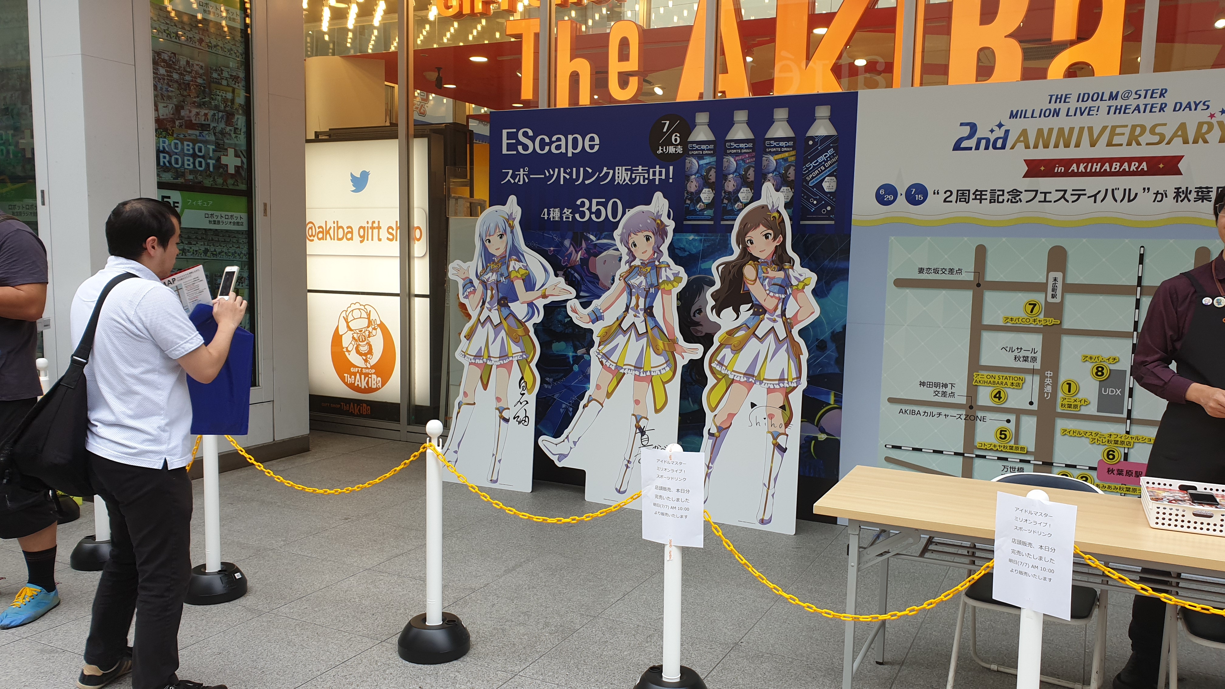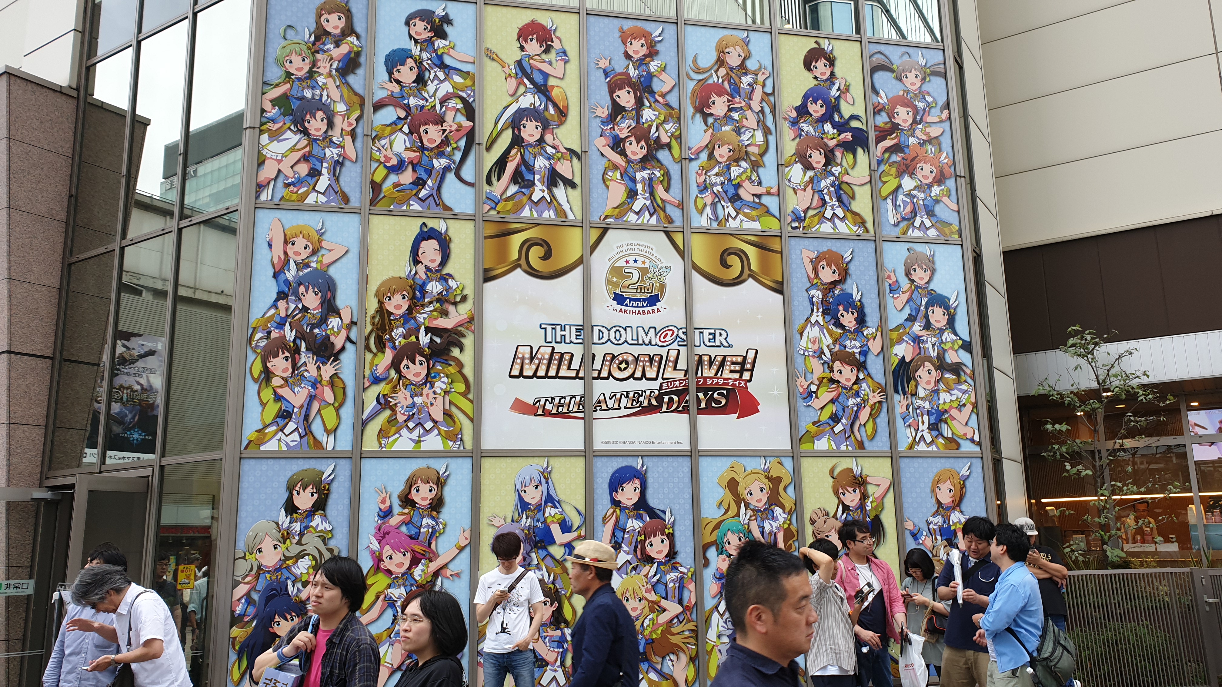 아사쿠사바시의 숙소에 짐을 맡겨놓고 찾은 아키하바라는 과연 온 데 사방천지가 밀리언 라이브의 캐릭터들로 가득했다. 아키하바라를 찾는 오타쿠들을 반기는 아트레 아키하바라의 유리창에는 우리가 게임 속에서 늘 만나는 아이돌들의 그림이 커다랗게 붙어 있었다. 그야말로 2주년 축제라는 느낌이 물씬 드는 광경이었다. 일단 배를 채우기 위해 칸다 강을 건너러 UTX 건물을 지나는데, 때마침 밀리언 스타즈 성우들이 공개 라이브를 하고 있어서 생각지도 못하게 성우들의 모습을 두 눈으로 목격하는 일까지 있기도 했다. 사진촬영이 금지되어 있어서 아쉽게도 사진을 찍지는 못했지만, 첫 발걸음부터 무척 운이 좋다는 생각이 들었다.
