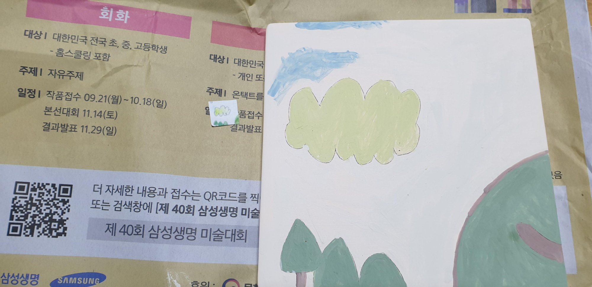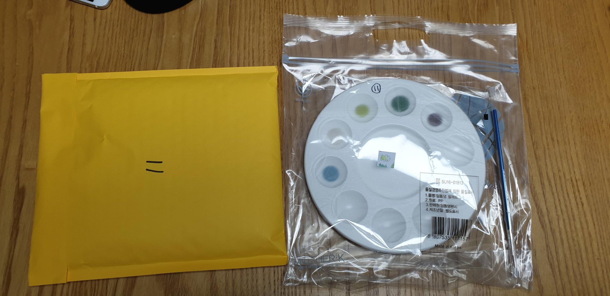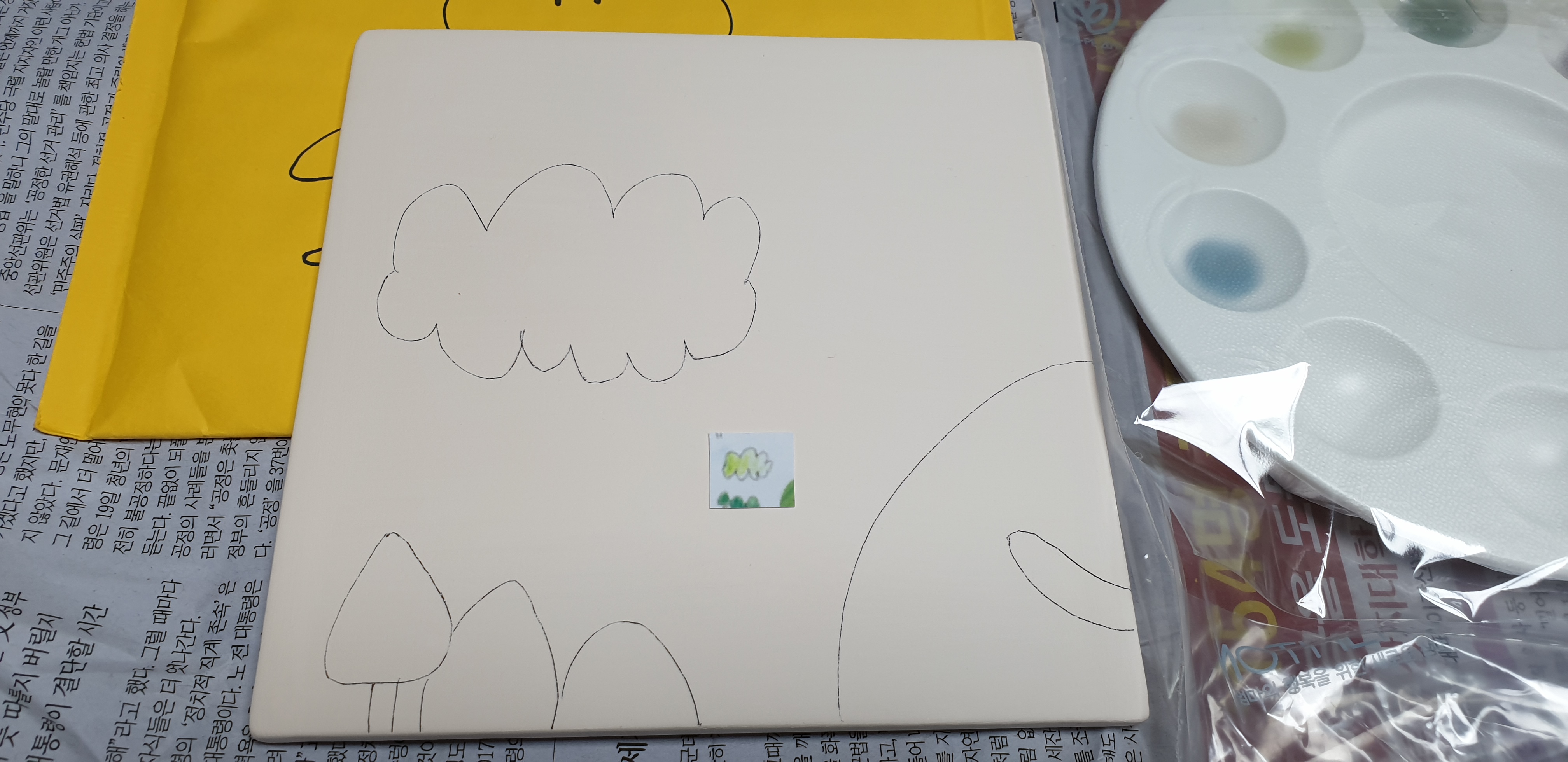 아내가 가지고 온 봉투를 열어 보니 대략 이런 물건들이 들어 있었다. 타일이 담긴 노란색 충격방지 봉투와 미리 물감을 짜 둔 팔레트, 가느다란 붓 한 자루, 그리고 칠해야 할 조각의 도안이 구성품의 전부이다. 딱 필요한 내용들만 담은 단촐한 구성이다.