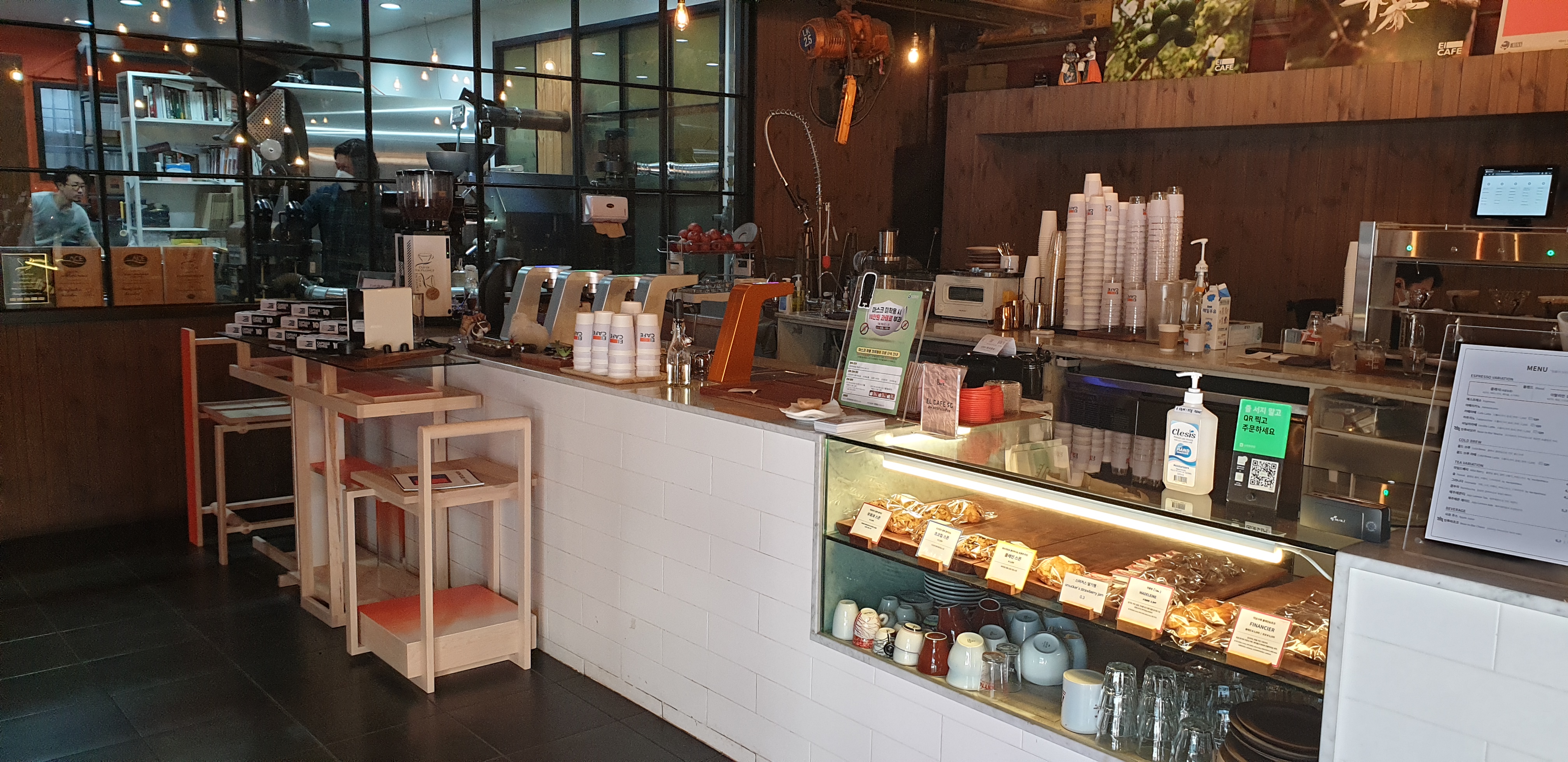 카페 문을 통해 들어가면 카운터와 로스팅 공간이 한눈에 들어온다. 거대한 로스터들이 열심히 돌아가고 있는 모습이 훤히 보이는 로스팅실을 배경으로 마치 미래에서나 볼 법한 빌트인 에스프레소 머신과 자동 푸어오버 머신이 눈에 띈다. 푸어오버 머신에는 드리퍼들이 놓여 있고, 자동으로 노즐이 그 위를 뱅글뱅글 돌면서 물을 일정하게 붓고 있었다. 영상에서는 많이 보던 광경이지만 실제로 보다니 퍽 신기했다. 내부에 앉을 자리는 그리 많지 않았지만(코로나의 영향 때문인 듯도 싶었다), 정갈하고 모던한 인테리어가 제법 훌륭했다. 메뉴를 보고, 일단 엘카페 오리지널 블렌드 드립 커피를 한 잔 시키기로 하였다. 푸어오버와 프렌치프레스 중 한 가지를 고를 수 있다기에, 이번에는 일단 푸어오버를 부탁드리기로 했다. 한 잔에 6,000원.