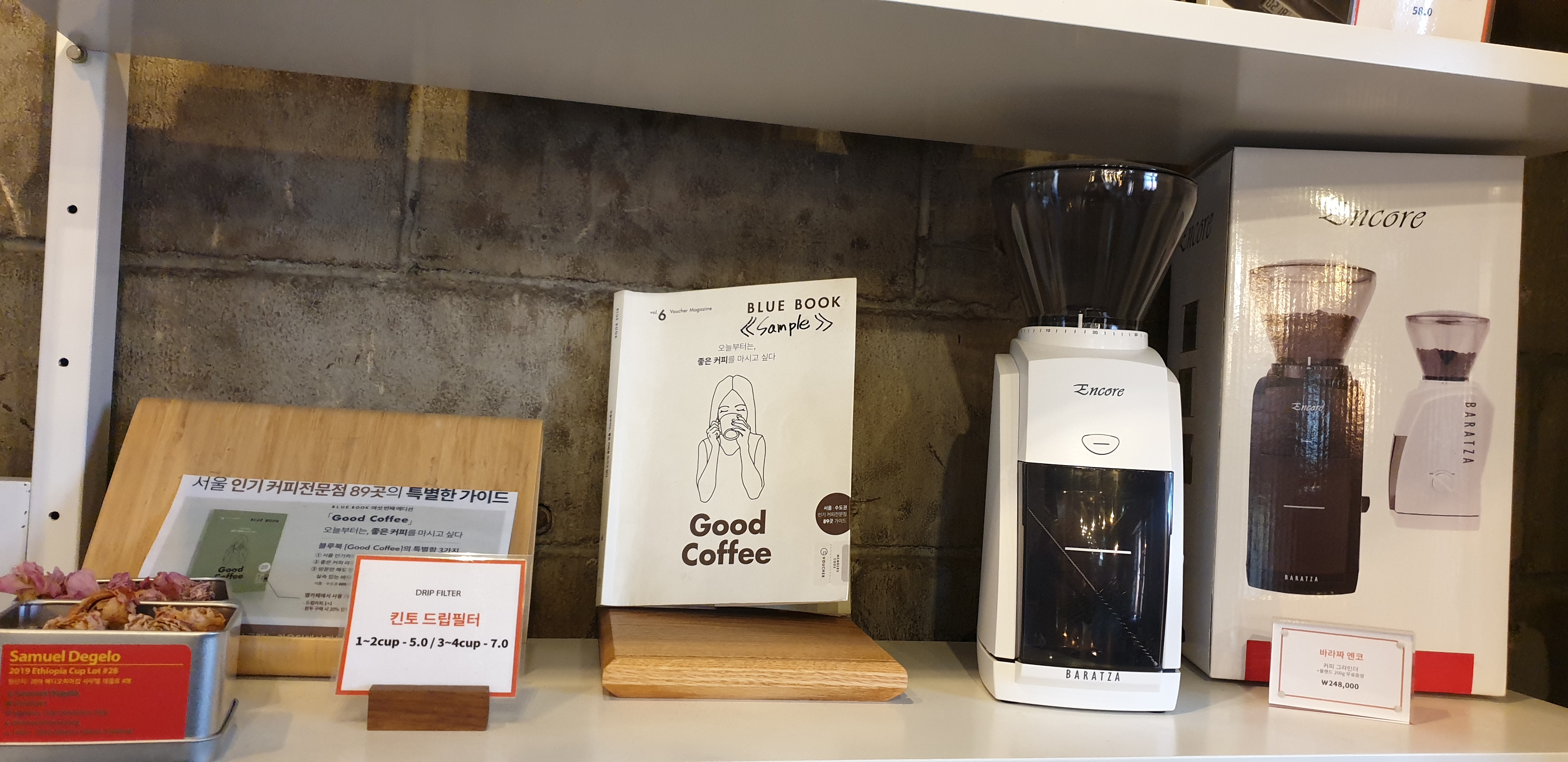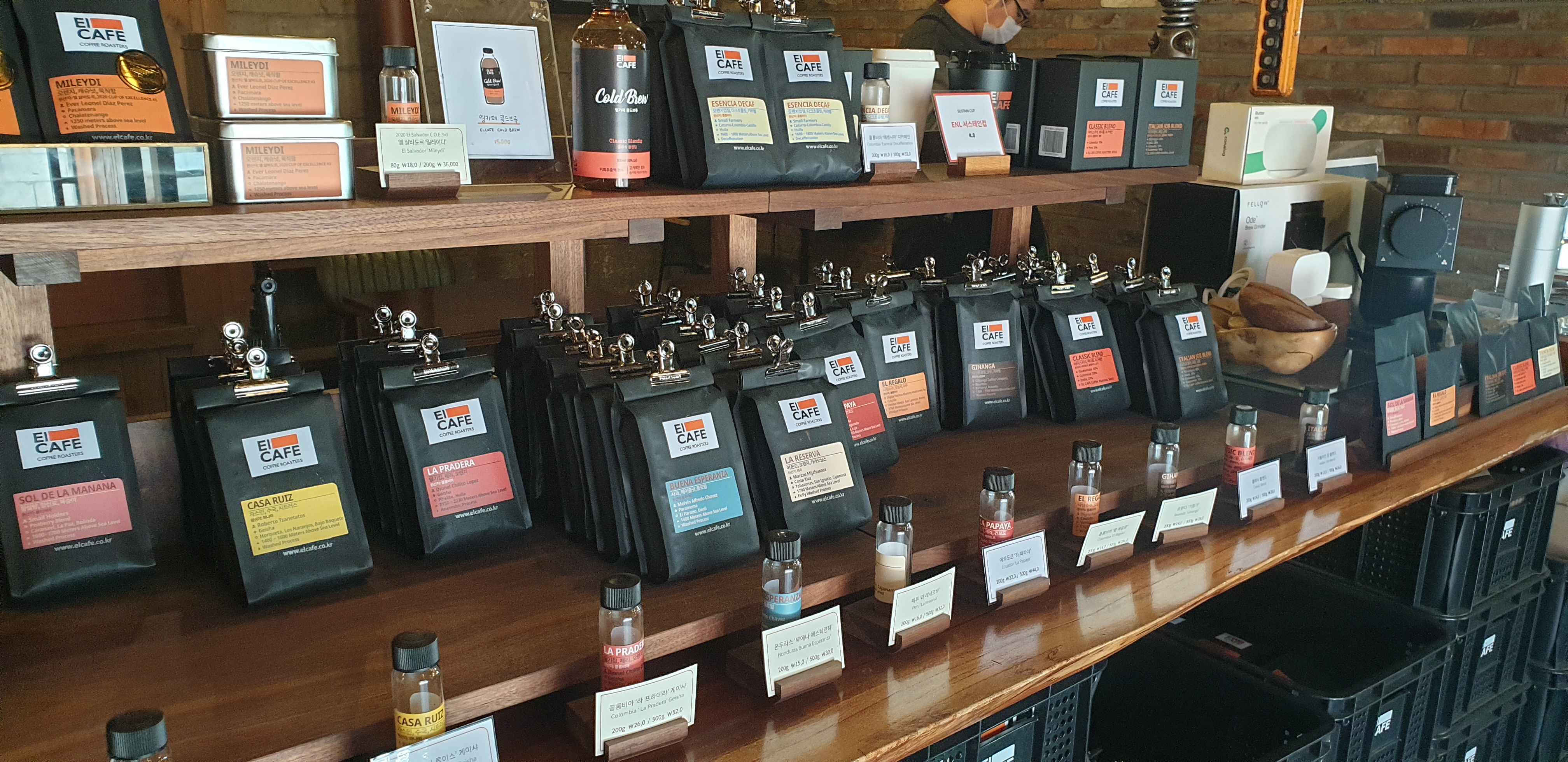 좌석 외에 눈에 들어오는 것은 계산대 오른쪽으로 펼쳐져 있는 전시 공간이다. 가지각색의 원두와 드립백이 현란하게 진열되어 있다. 엘카페 특유의 시그니처 블렌딩 원두는 물론이고, 싱글오리진 스페셜티 원두들도 제법 눈에 띄었다. 아쉽게도 고작 며칠 전에 베라커피 아울렛에서 이미 원두 두 팩을 사 둔 터라, 눈물을 머금고 시그니처 블렌딩 원두 한 팩만을 사기로 했다.