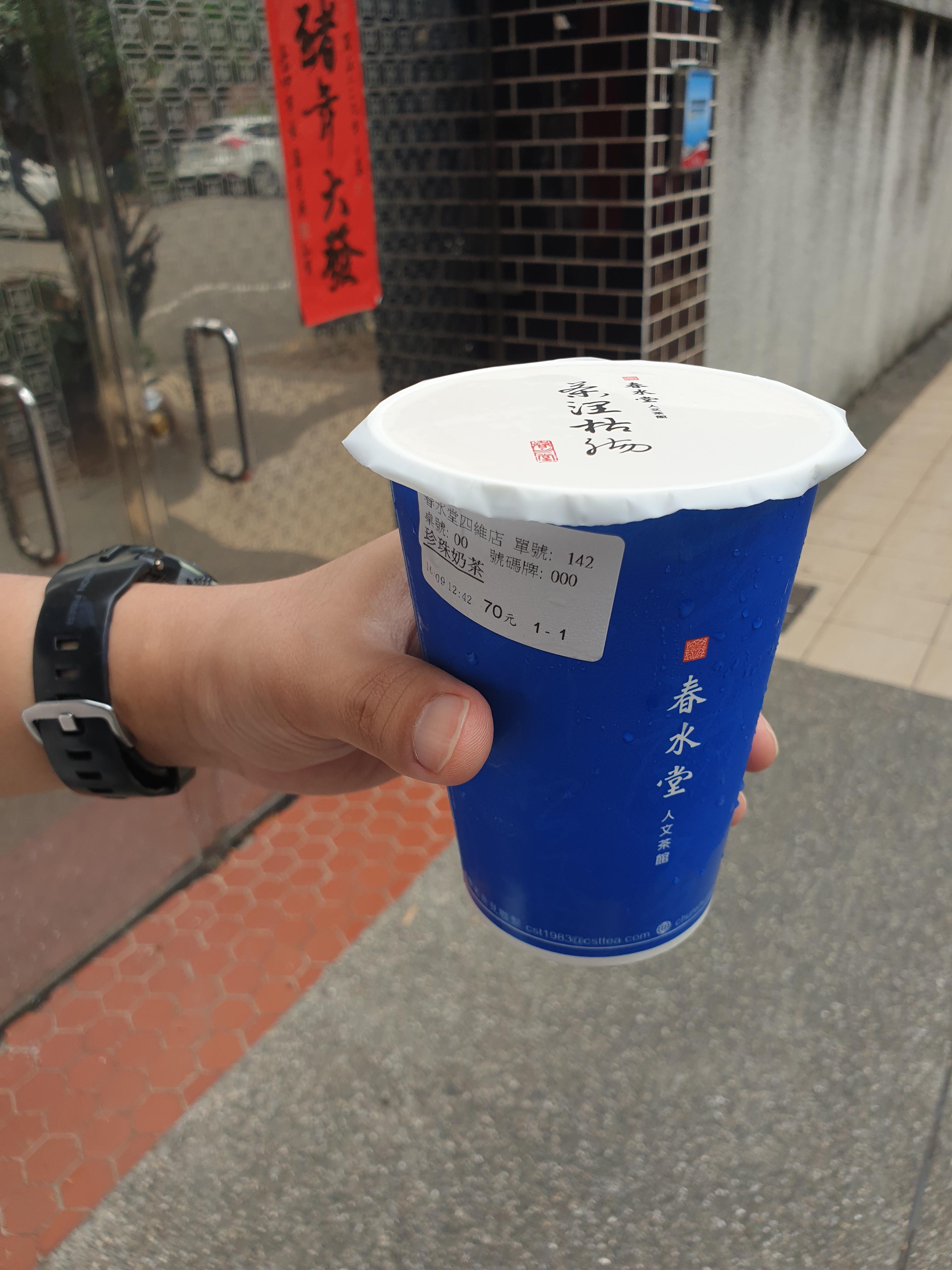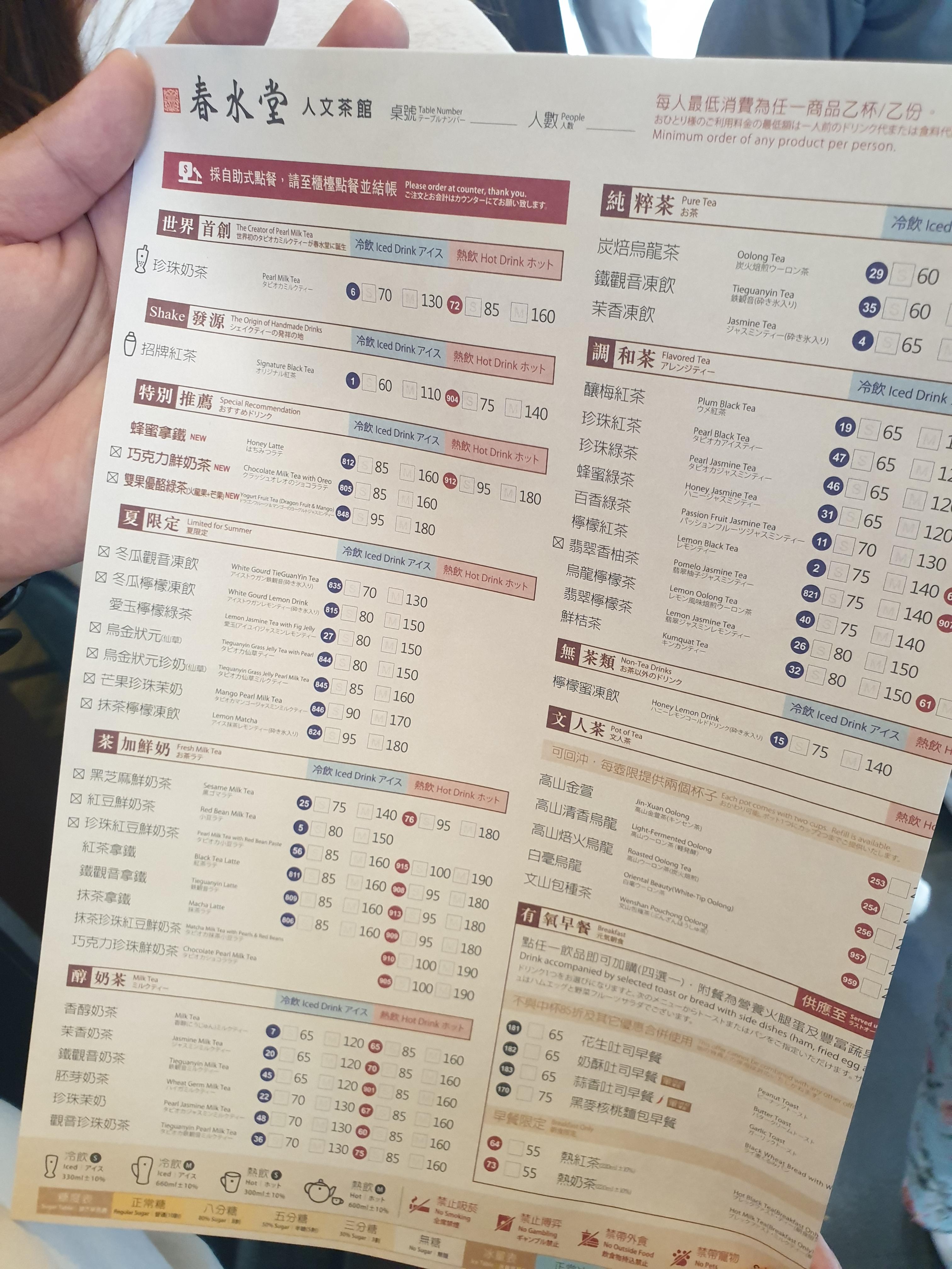 이 날의 날씨는 전날과는 달리 퍽 흐렸지만, 조금 더 남쪽으로 내려온 탓인지 만만치 않게 더웠다. 땀을 연신 닦아내면서 15분 넘게 걸은 끝에 가까스로 춘수당에 도착할 수 있었다. 과연 버블티의 원조라는 명성이 자자한 가게, 줄서 있는 사람들이 드글드글했다. 가게 앞으로 들어서면 직원이 큰 소리로 안내를 해 주는데, 안내대로 줄을 서 있으면 직원이 종이로 된 메뉴판 겸 주문서를 가져다 준다. 중국어와 일본어, 영어의 3개 국어로 내용이 자세하게 쓰여 있고, 원하는 내용을 찾아 메뉴판에 체크해서 주문하고 선결제를 한 뒤 잠깐 기다리면 점원이 순서를 불러 준다. '인문다관'이라는 별칭이 붙어 있는 만큼 버블티뿐만 아니라 우롱차나 보이차 등 다른 차와 디저트들도 팔고 있고, 심지어는 간단한 식사류도 파는 듯했다. 점원이 연신 우롱차와 파르페, 때로는 완탕면 비슷한 것들을 들고 서빙하는 것이 보였다.