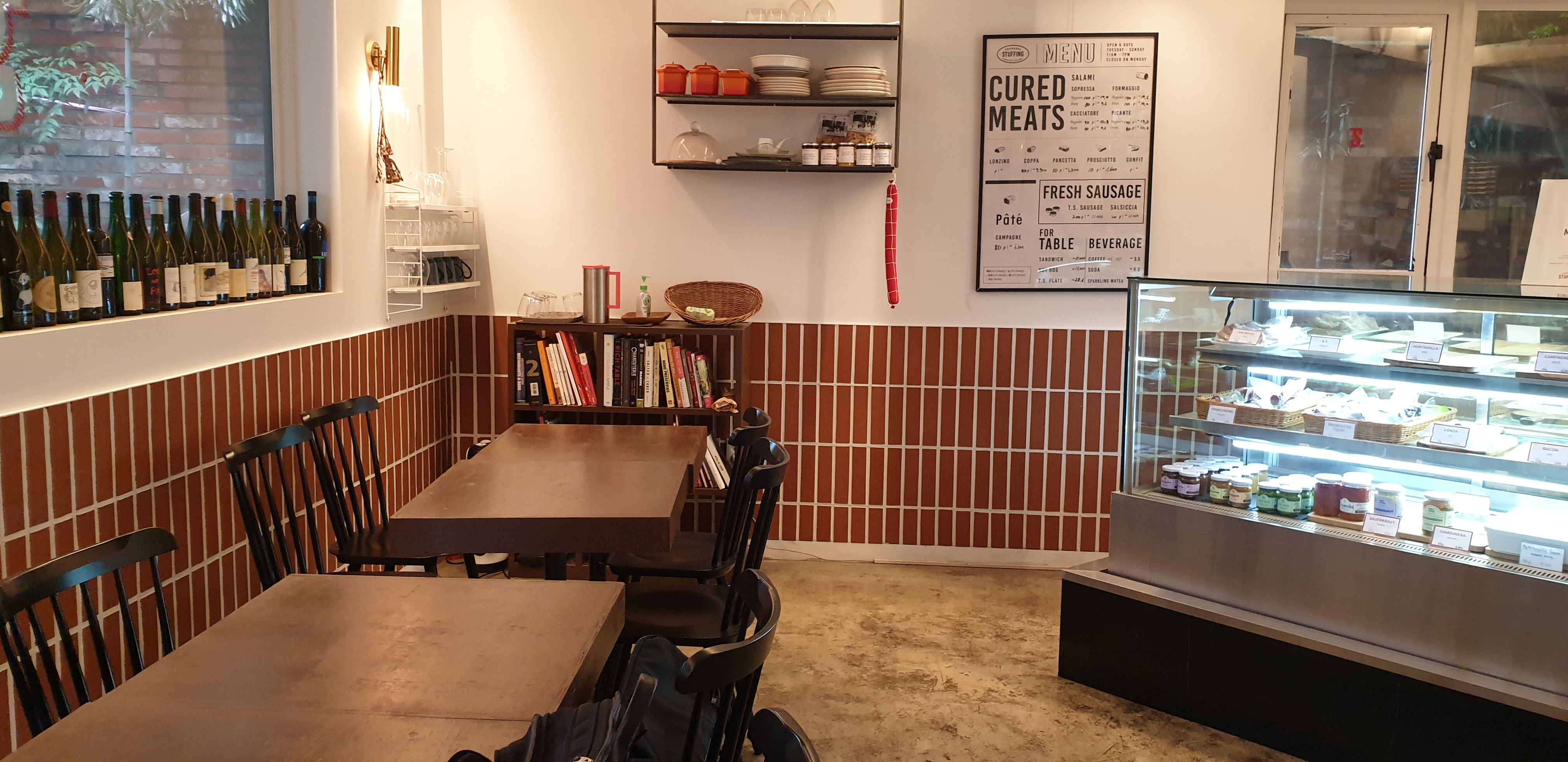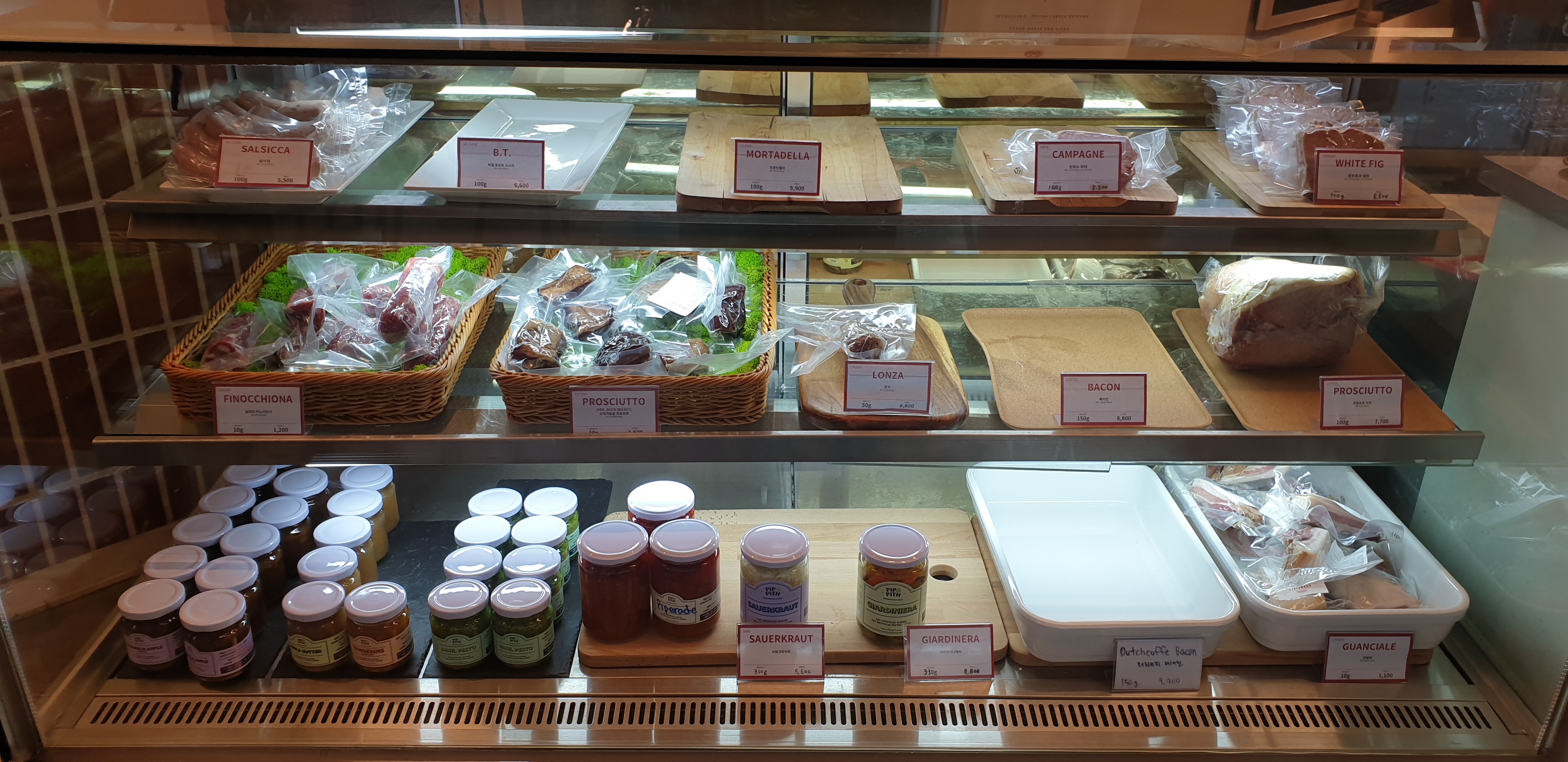 반지하로 되어 있는 가게 안으로 들어가면, 큰 창을 내어 시원한 느낌을 주는 식사 공간과 카운터가 눈에 들어온다. 카운터 왼쪽의 디스플레이에는 그날 나와서 팔리고 있는 가공육과 각종 소스류들이 전시되어 있다. 기본적으로 이 집의 식품류는 무엇 하나 빠짐없이 다들 너무 맛있기 때문에, 늘 가게에 올 때마다 깊은 고민을 하기 일쑤다. 이번에 갔을 때에는 소시지류와 깜빠뉴 종류가 주를 이루고 있었고, 생햄은 오리 프로슈토와 프로슈토 꼬토 정도가 준비되어 있었다. 매번 갈 때마다 준비되어 있는 가공육의 종류가 다르기는 하지만, 기본적으로 소시지와 살라미류, 특히 샌드위치에 넣기 좋은 모르타델라는 거의 항상 준비되어 있는 편이다.